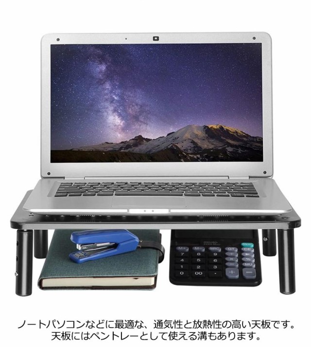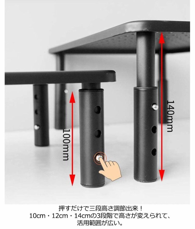 | パソコンのモニターに高さを出したり、スペースを有効活用するためのモニター台。 押すだけで三段高さ調節出来!10cm・12cm・14cmの3段階で高さが変えられて、活用範囲が広い。 頑丈なスチール製です。耐荷重20kgで、しっかり物を支えます。ゴム脚なので、設置面を傷つけません。 ノートパソコンなどに最適な、通気性と放熱性の高い天板です。天板にはペントレーとして使える溝もあります。 ディスプレイ下のスペースには、未使用時のキーボードやマウスが格納可能。机上で使う小物類やキーボードなどの周辺機器もすっきりと収納出来ます。 また水濡れにも強く、飲み物をこぼしてしまっても慌てる必要はありません。軽く拭き取るだけと手入れも簡単です。 | |