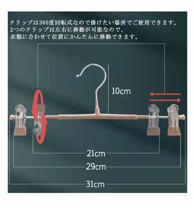 | ズボン、スカート、帽子などを掛けることができるハンガーです。 強力なクリップで衣類をしっかりキープして、滑り落ちないです。 クリップは360度回転式なので掛けたい場所でご使用できます。 2つのクリップは左右に移動が可能なので、衣類に合わせて位置にかんたんに移動できます。 | |