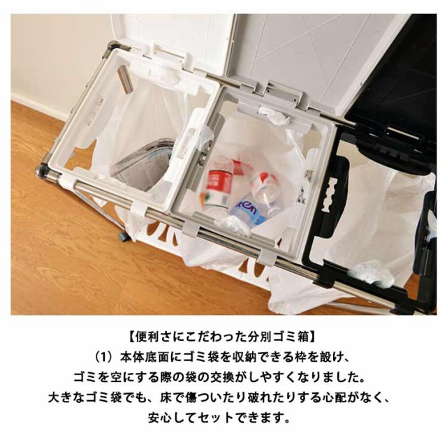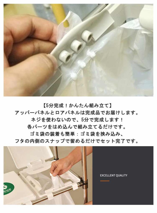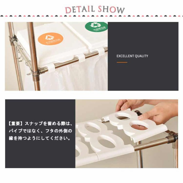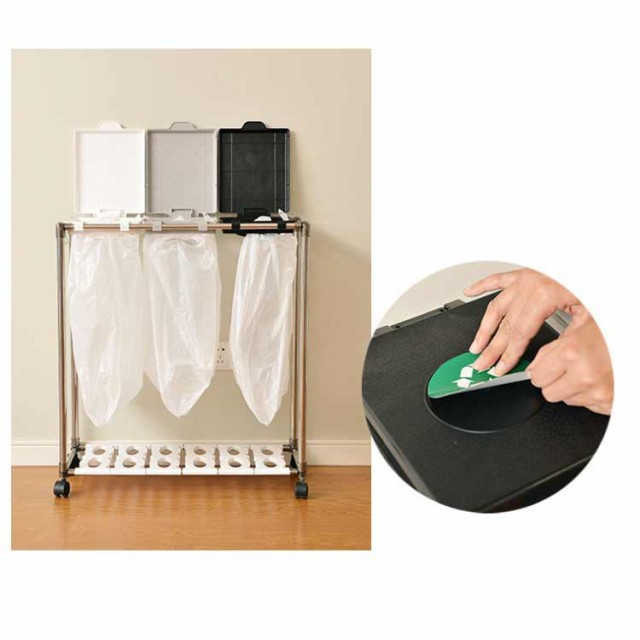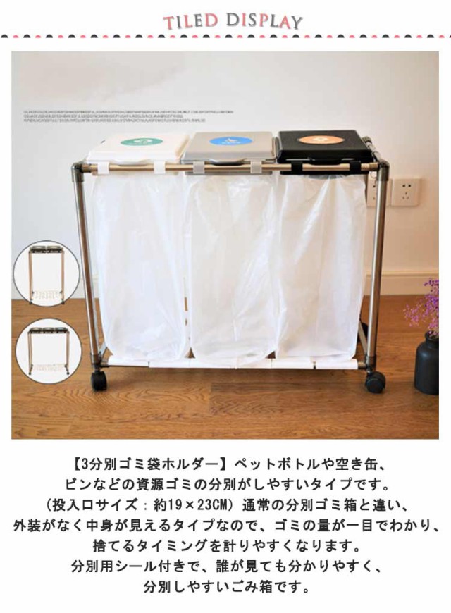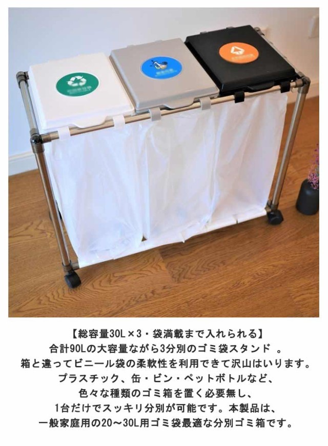 | 【3分別ゴミ袋ホルダー】ペットボトルや空き缶、ビンなどの資源ゴミの分別がしやすいタイプです。(投入口サイズ:約19×23cm)通常の分別ゴミ箱と違い、外装がなく中身が見えるタイプなので、ゴミの量が一目でわかり、捨てるタイミングを計りやすくなります。分別用シール付きで、誰が見ても分かりやすく、分別しやすいごみ箱です。 【5分完成!かんたん組み立て】アッパーパネルとロアパネルは完成品でお届けします。ネジを使わないので、5分で完成します!各パーツをはめ込んで組み立てるだけです。ゴミ袋の装着も簡単:ゴミ袋を挟み込み、フタの内側のスナップで留めるだけでセット完了です。 【重要】スナップを留める際は、パイプではなく、フタの外側の縁を持つようにしてください。 【総容量30L×3・袋満載まで入れられる】合計90Lの大容量ながら3分別のゴミ袋スタンド 。箱と違ってビニール袋の柔軟性を利用できて沢山はいります。プラスチック、缶・ビン・ペットボトルなど、色々な種類のゴミ箱を置く必要無し、1台だけでスッキリ分別が可能です。本製品は、一般家庭用の20?30L用ゴミ袋最適な分別ゴミ箱です。 【安定感のあるステンレス製パイプ】ごみ袋ホルダーは直径2cmのステンレス製パイプでしっかり支え、錆びにくい特徴もあります。分別ダストワゴの底部にスイスイ動くキャスターが付き、お掃除の際の移動もスムーズです。4脚にロック機能付きのキャスターで足元を固定してぐらつき防止できます。 【便利さにこだわった分別ゴミ箱】(1)本体底面にゴミ袋を収納できる枠を設け、ゴミを空にする際の袋の交換がしやすくなりました。大きなゴミ袋でも、床で傷ついたり破れたりする心配がなく、安心してセットできます。(2)側面のフックは、電池やニュートンなどの小物を収納するのにおすすめで、普段出ないゴミや時間がかかって溜まるゴミを所定の場所に収納できます。もちろん、小物の吊り下げ収納にも使用でき、無駄なく使用することができます。 | |