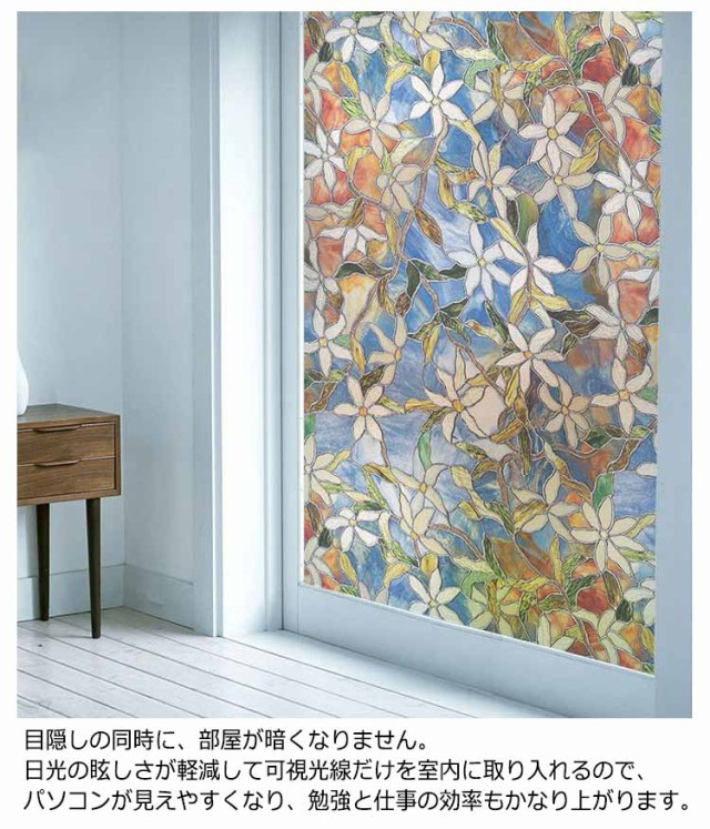 | 何度でも貼り直しできるガラスフィルムです。【ステンドグラス風】 剥がすときはのり跡が残らないので賃貸住宅でも気軽にご使用いただけます。 目隠しの同時に、部屋が暗くなりません。日光の眩しさが軽減して可視光線だけを室内に取り入れるので、パソコンが見えやすくなり、勉強と仕事の効率もかなり上がります。 鮮やかなカラーが窓をおしゃれで楽しい雰囲気にしてくれます。 貼り付け方: 1.貼り付けたい箇所のサイズにあわせてシートをカットします。 2.貼り付けたい箇所を塵や埃のないよう拭き取ってください。 3.水の入ったスプレーで窓を十分に濡らします。 4.台紙からシートを少し剥がし、端から少しずつ貼り付けていきます。スキージーをお使いいただくとスムーズに貼り付け頂けます。 5.空気が残らないように全体をならして完成です。 | |