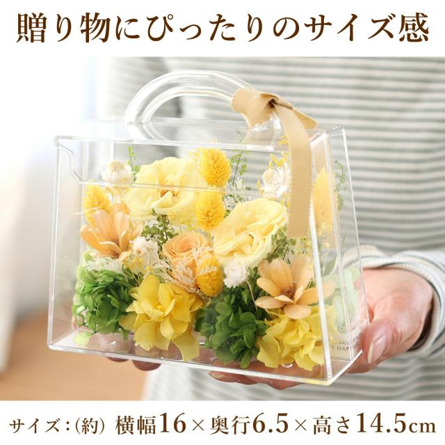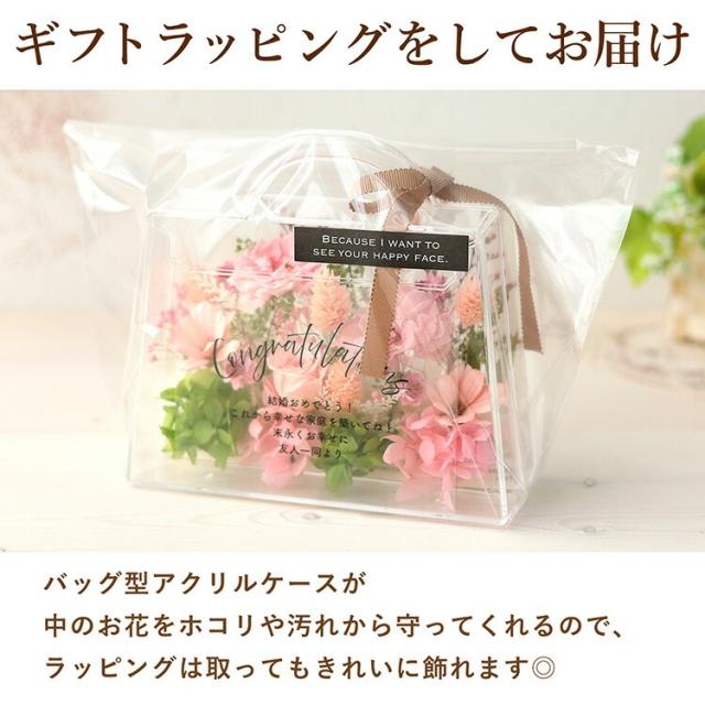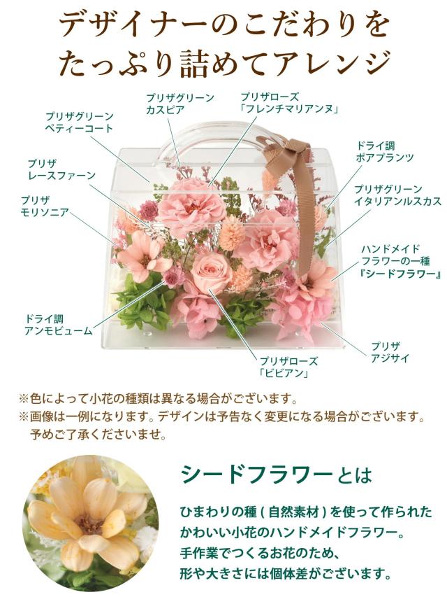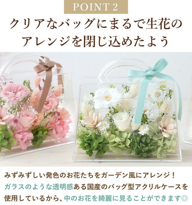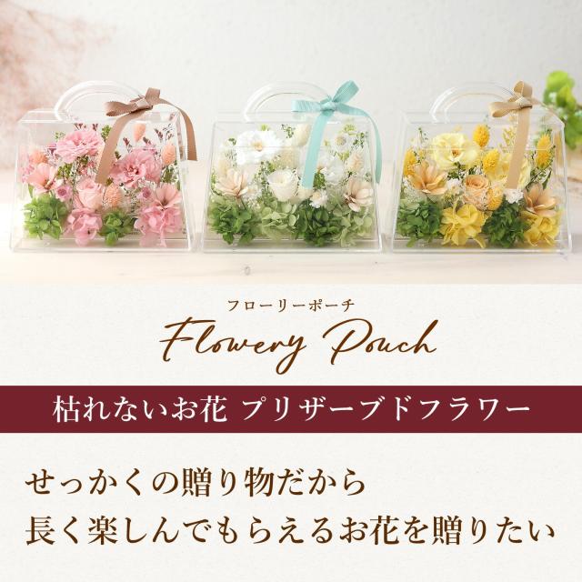 入れ対応のプリザーブドフラワー「フローリーポーチ」は、バッグ型の可愛いアレンジが魅力。
