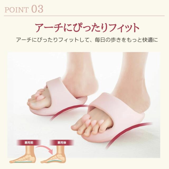 足指をホールドするぷにゅぷにゅパッド構造と、柔軟性のある素材で、さまざまな足型に対応。