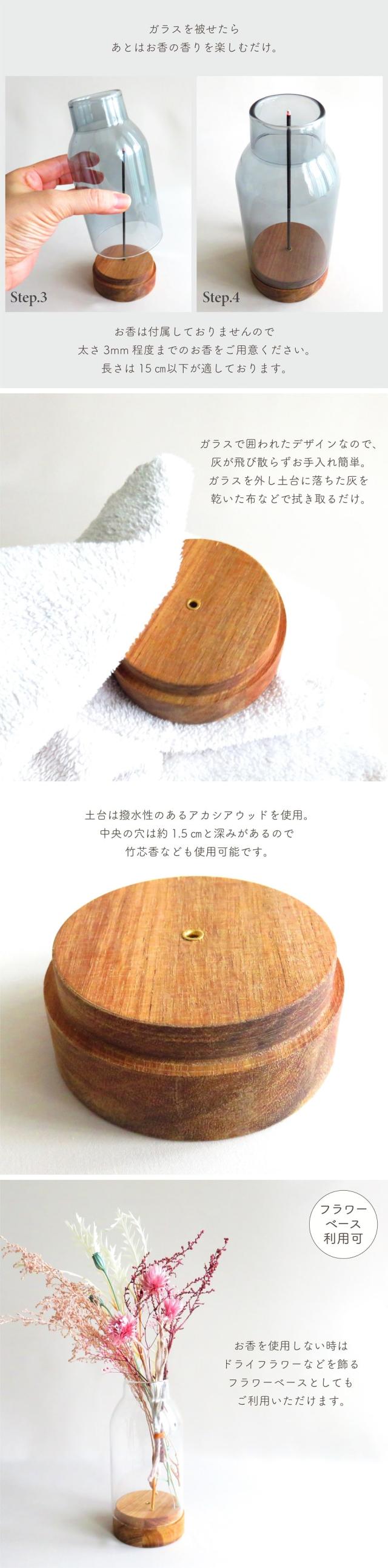 ガラスで覆われたデザインなので、灰が飛び散らずお手入れも簡単。土台に落ちた灰を拭き取るだけ。土台は撥水性のあるアカシアウッドを使用。中央の穴は約1.5cmと深みがあるので竹芯香なども使用可能です。 お香を使用しない時はドライフラワー等を飾るフラワーベースとしてもご利用いただけます。