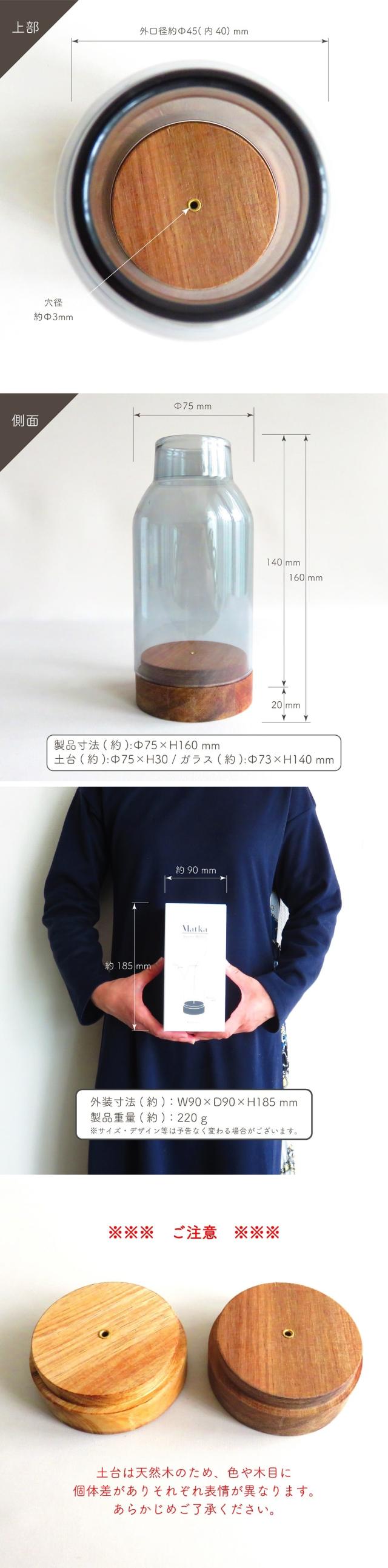 土台(約):Φ75×H30 mm / ガラス(約):Φ73×H140 mm 穴径(約):Φ3mm |