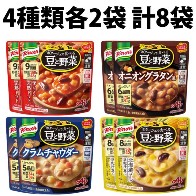 味の素 クノール豆と野菜 ポタージュで食べる 2種 合計 8袋 オニオングラタン風 クラムチャウダー 北海道コーン豆乳仕立て 深いコクの完熟トマト ポタージュ スープ クノール豆 野菜 北海道コーン 深い コクの完熟 和食 タンパク質 副菜 汁物 主菜 食物繊維 オニオングラタン