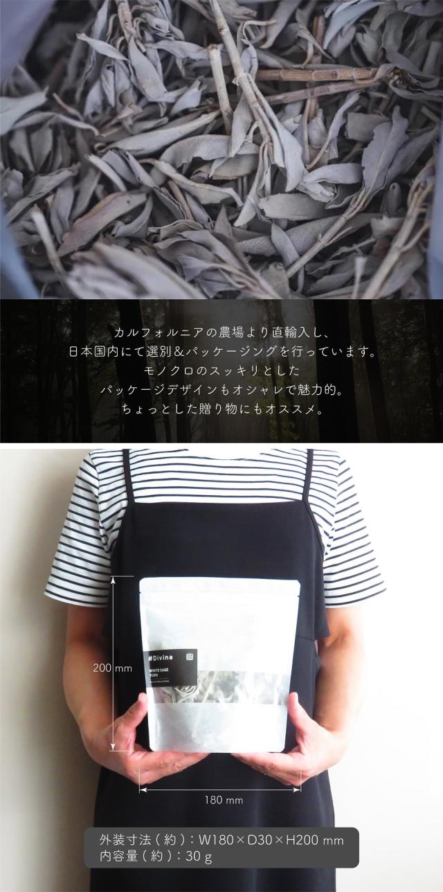 同じく浄化力の高い神の木と言われている香木「パロサント」と合せて使用することにより効能がUP。カリフォルニアの農場より直輸入し、日本国内にて選別パッケージングを行っています。ホワイトを基調としたモノクロのパッケージデザインもオシャレで魅力的。ちょっとした贈り物にもオススメです。