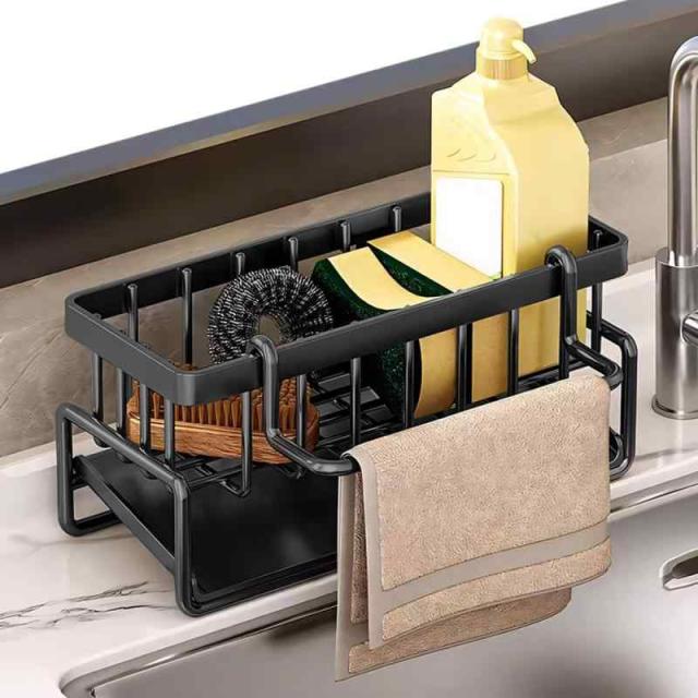 LONGAIXIN スポンジホルダー スポンジラック防錆 キッチン用 布巾掛け付き 置き型 たわし入れ 水切り機能 取り外せるドレンパン スポンジ洗剤置き
