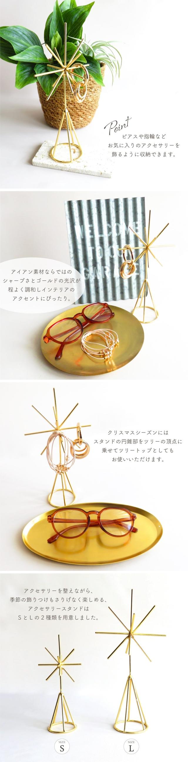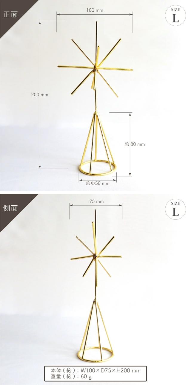 上品なゴールドのラインが特徴的な、ツリートップとしても使えるLサイズのアクセサリースタンド。放射状に組まれたシンプルなラインが、ミニマルでありながら存在感のあるデザイン。ピアスや指輪などお気に入りのアクセサリーを飾るように収納できます。アイアン素材ならではのシャープさと、ゴールドのやわらかな光沢が程よく調和し、インテリアのアクセントにぴったりです。
