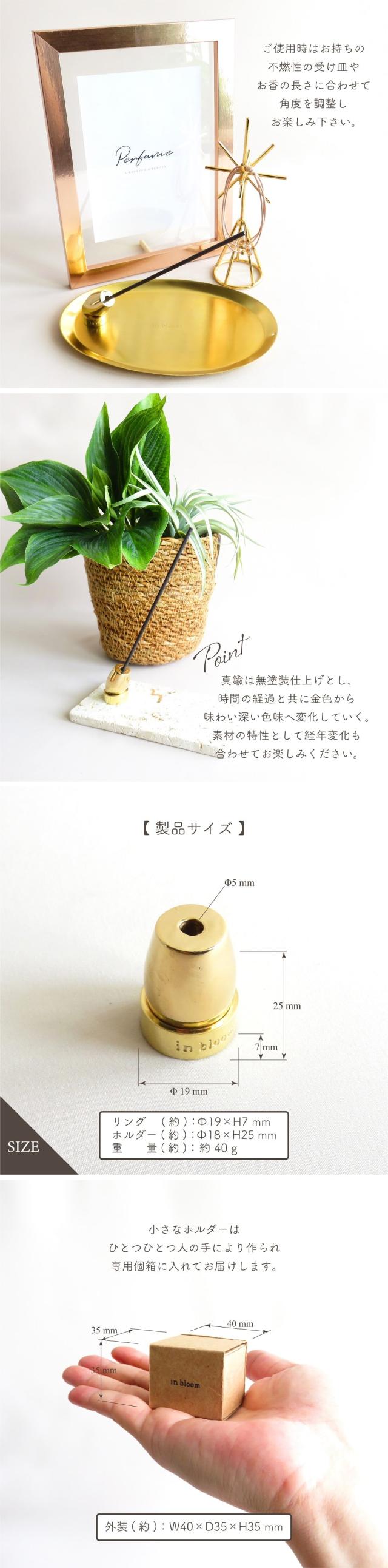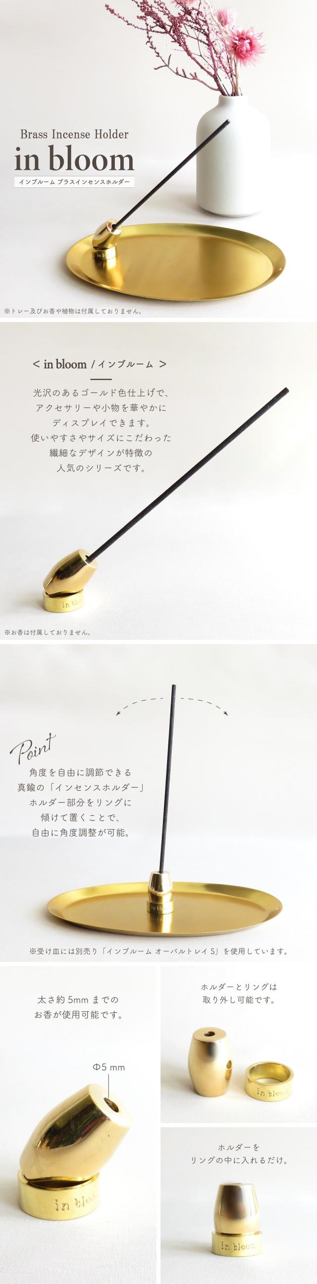 リングの側面には「in bloom」刻印が入っています。ホルダーとリングは取り外しが出来るので、灰で汚れた際のお手入れも簡単。使用時もホルダーをリングに入れるだけ、持っているお皿やお香の長さに合わせて角度に調整し、香りをお楽しみいただけます。