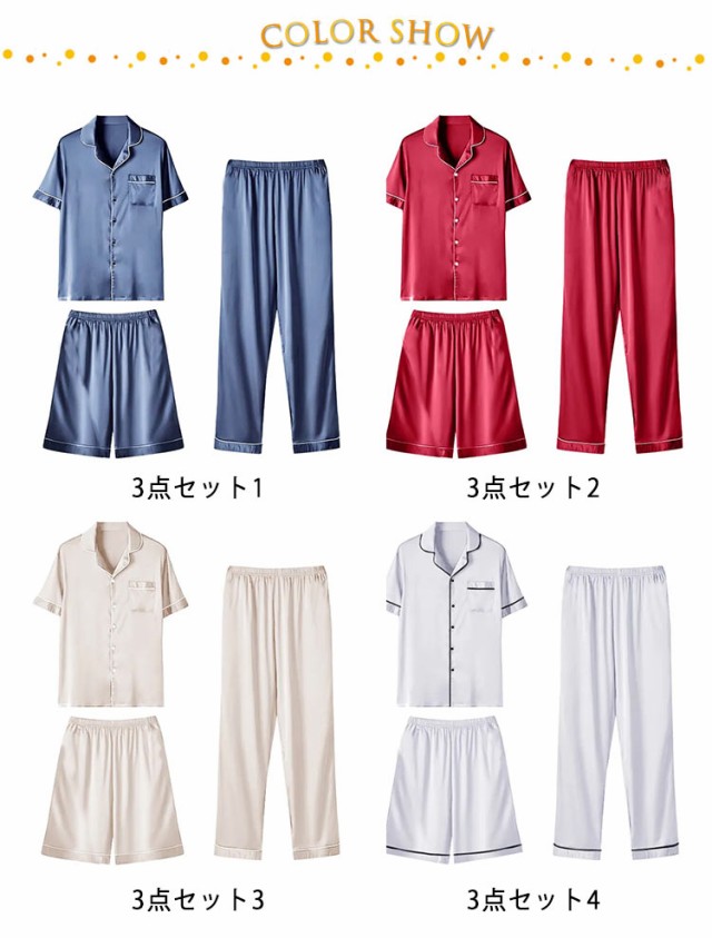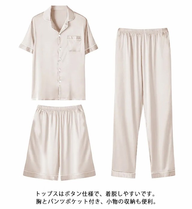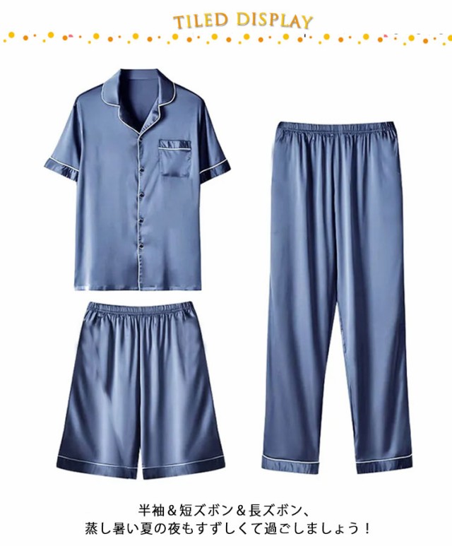 | 接触冷感生地のパジャマ3点セットです。 さらりとした肌触りの素材を、風が通りやすいゆったりシルエットに仕上げているので、暑い季節も快適です。 半袖&短ズボン&長ズボン、蒸し暑い夏の夜もすずしくて過ごしましょう! お風呂上がりにこのパジャマを着て、爽やかを感じます。 トップスはボタン仕様で、着脱しやすいです。胸とパンツポケット付き、小物の収納も便利。 生地の肌觸りはよく、部屋にリラックス著用できます。 軽くて、旅行にも出張にも持ち込むok! お誕生日プレゼントや父母の日ギフトなど、贈り物にも最適ですお祝いの品等、様々な場面で贈り物としてご利用ください。 | |