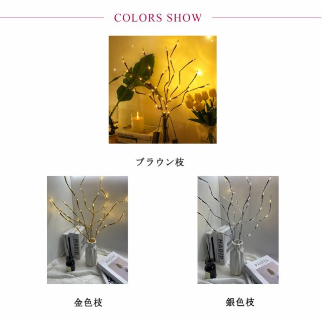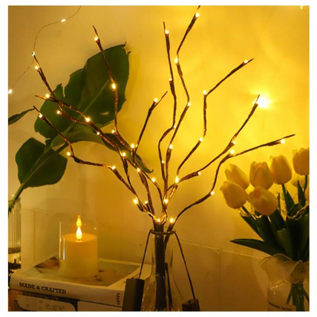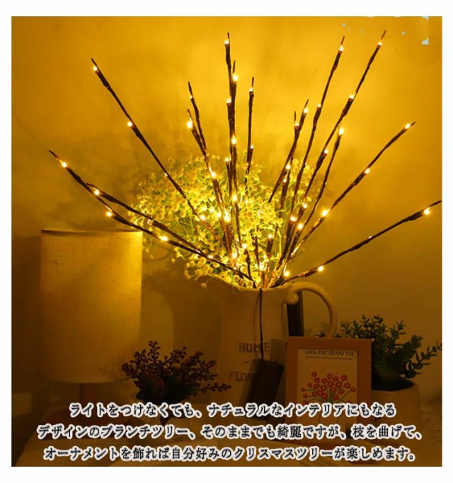| 花瓶に挿すだけで素敵な空間作りに。 LEDライト付きのブランチツリー、1つの枝にLEDが20球も付き、お部屋のインテリアとしてぴったりのサイズ感です。 ぬくもりあふれる優しい光でお部屋を照らしてくれ、夜のお部屋のインテリアに最適! ライトをつけなくても、ナチュラルなインテリアにもなるデザインのブランチツリー、そのままでも綺麗ですが、枝を曲げて、オーナメントを飾れば自分好みのクリスマスツリーが楽しめます。 電池式なのでコンセント不要で場所を選びません。ベッドサイドや机の上にお花の代わりとして飾れます。 | |