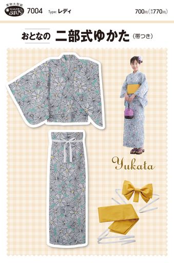 ゆかたは着たいけれど、自分でうまく着付けられない!という方におすすめ。 上下が別々になったゆかたと、ただ巻き付けるだけの帯で着崩れせず、簡単ゆかた美人に!(帯は囲み製図とつくり方がついています。)