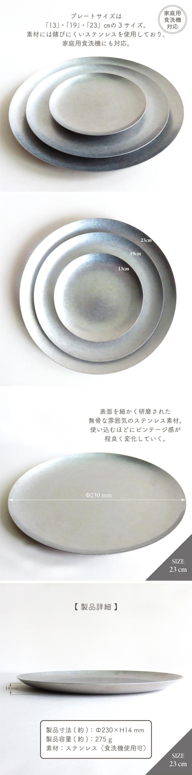 ステンレスのクールなカラーとマットな質感がまとう上質な雰囲気はヴィンテージ&インダストリアルアイテムが好きな方におすすめ。ゲストへのおもてなしから普段使いまで幅広いシーンでお使いいただけます。23cmは盛り皿やワンプレート皿としてオススメです。