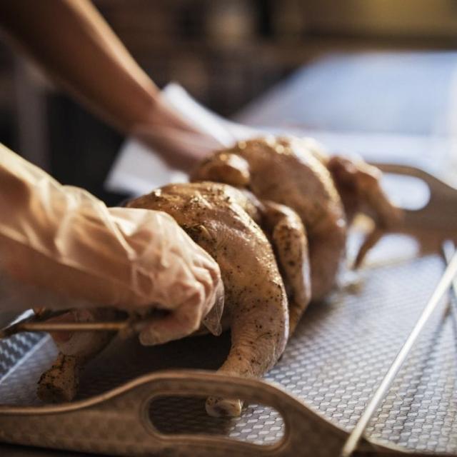 専用のロティサリーオーブンで回しながらじっくりと焼き上げているので、余計な脂が落ちながらもジューシーな仕上がり。