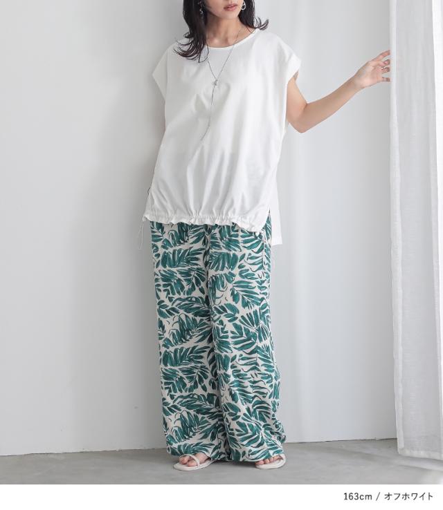 | staff:T/159cm B77 W58 H91 【普段着用】 Tops:S/M Bottoms: M/L | 【フリーサイズ】 袖丈:ひじ上15cm位 着丈:太もも真ん中より上位 腕周り:ゆったり バスト:ゆったり 全体:ゆったり 袖丈は短いトップスですが、袖周りの生地がたっぷりしていて二の腕が程よく隠れました。裾を絞れるのでスッキリして見えます。 |