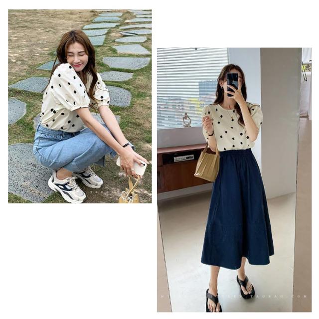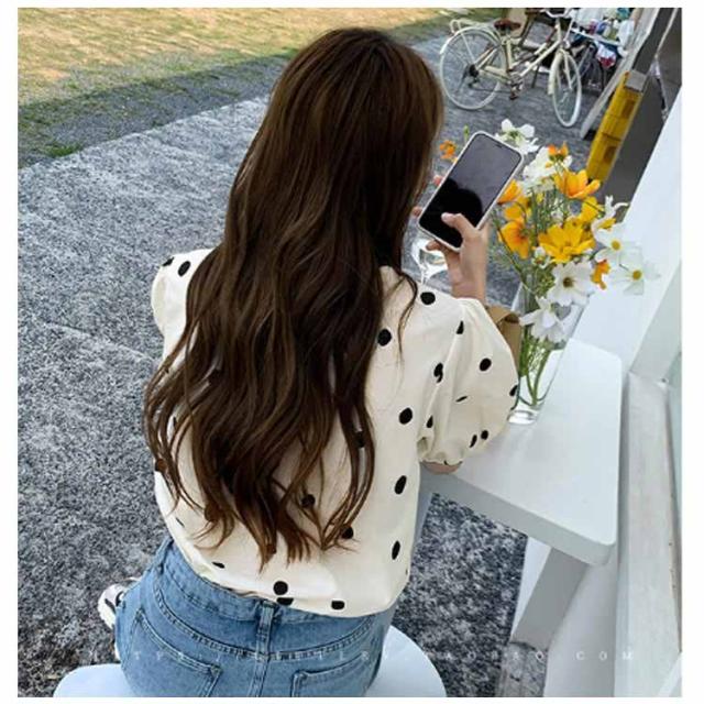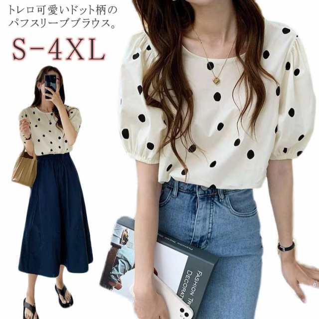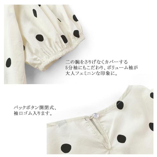 ドット柄 パフスリーブブラウス 夏 春 レディース シャツ トップス ドットブラウス ブラウス 半袖ブラウス パフスリーブ ボリューム袖 バックボタン トレロ