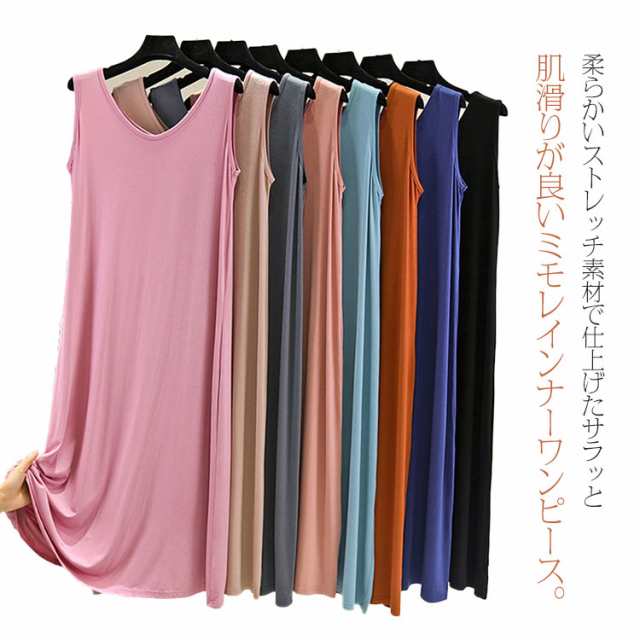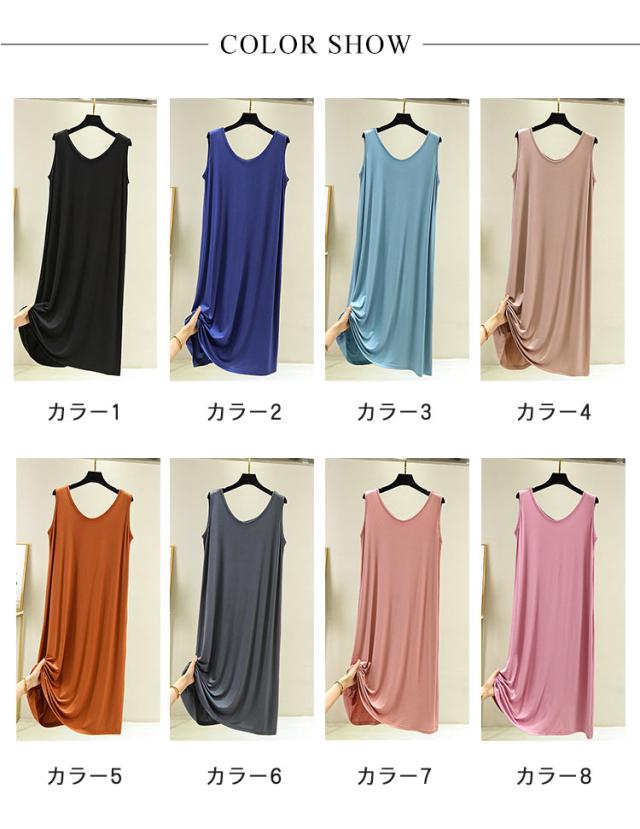 ワンピース レディース ミモレ丈ワンピース ロングワンピース インナーワンピース ノースリーブ 夏ワンピース カジュアルワンピース 膝下丈 Uネック 大人 シンプル 無地 レイヤード 部屋着 ルームウエア オシャレ ゆったり 春夏 送料無料