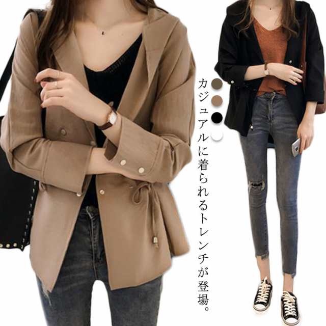 春 秋 アウター スプリングコート 送料無料 レディース 夏 薄手 トレンチコート ショート丈 前後アシンメトリー フード付き 大きいサイズ ゆったり ウエスト紐 シャーリング ウエストマーク 軽い 秋アウター カジュアル ベージュ カーキ 黒 白 大きいサイズ