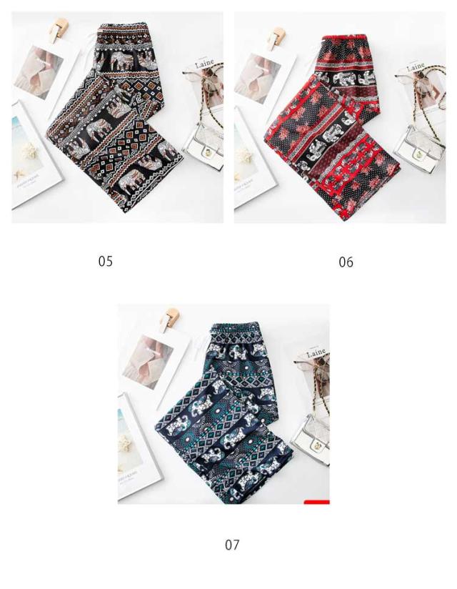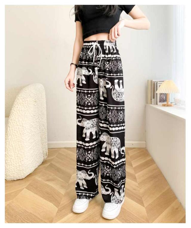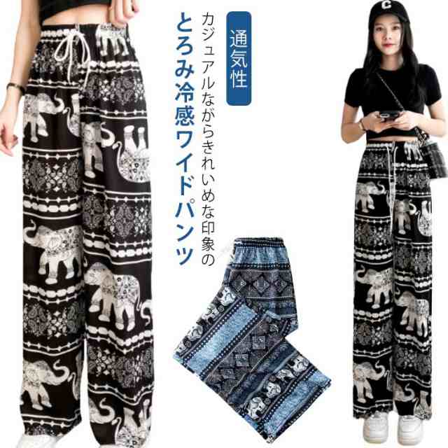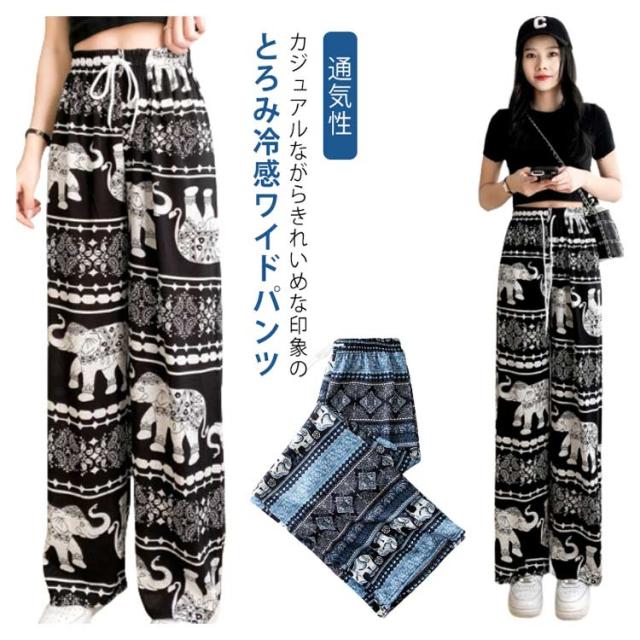 タイパンツ 接触冷感 パンツ ルームウェア ワイドパンツ レディース ゆったり 薄手 柄パンツ 象柄 冷感 涼感 接触冷感 夏 ゾウ 通気性 落ち感 部屋着 涼しい ロングパンツ 体型カバー ロングパンツ ヨガパンツ ボヘミアン風 旅行 ハイウエスト