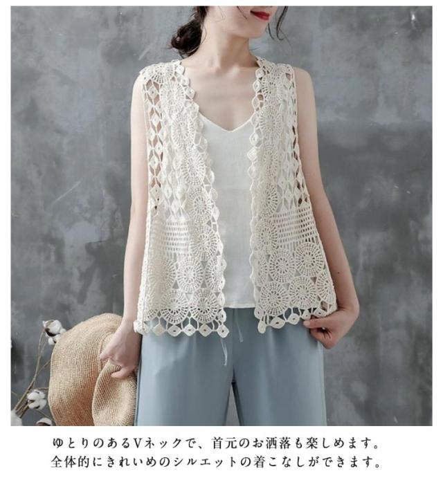 ベスト 透かし編み ノースリーブ ベスト ジレ レディース 前開き 総柄 トップス レイヤード かぎ編み ニット Vネック ベスト 透かし彫り サマー ニットベスト 春 夏 おしゃれ ジレベスト ショート丈 着回し 重ね着 薄手 カジュアル 体型カバー 通勤 可愛い