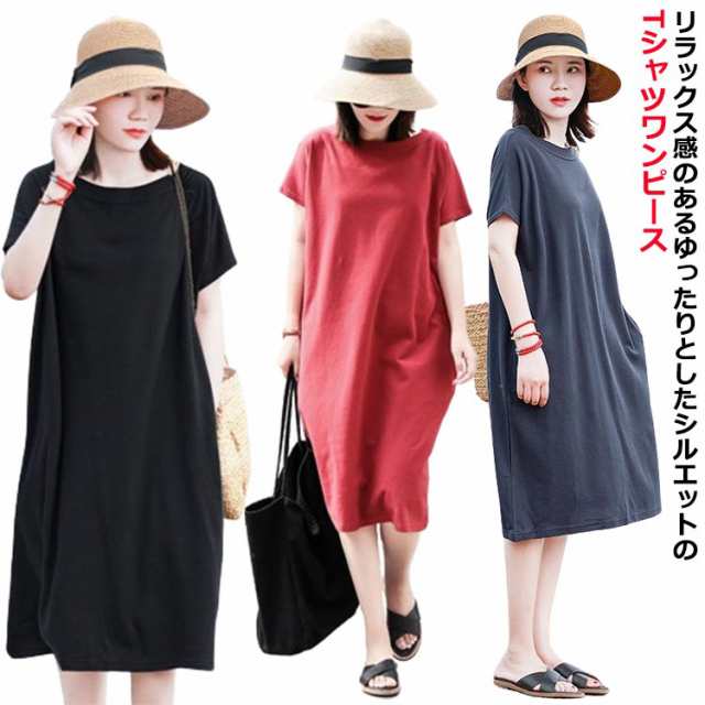 ワンピース 半袖 レディース ティーシャツワンピース 送料無料 Tシャツ ロング丈tシャツ Tシャツワンピース ロンT ワンピ クルーネック ミモレ丈 ゆったり 無地 大きいサイズ 膝丈 カジュアル デイリー 送料無料 夏 春 ダークブルー ブラック 黒