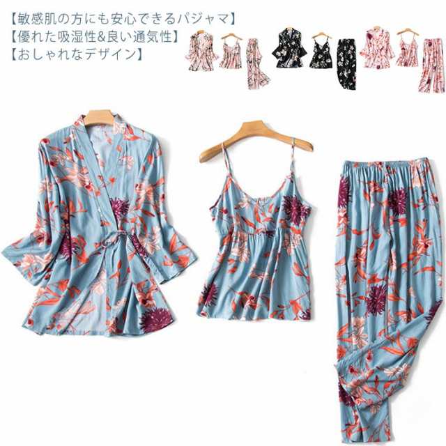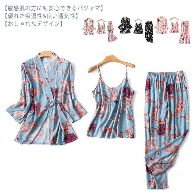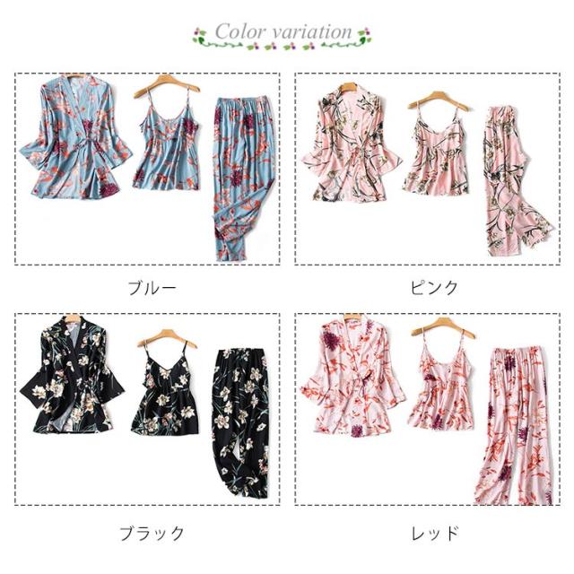 ルームウェア レディース 3点セット パジャマ 送料無料 寝巻き 総柄 部屋着 サテン調 可愛い 長袖 パンツ ズボン キャミソール 上下セット 秋 春 夏 和式 可愛い 長袖 長ズボン セクシー リラックス 在宅ウエア