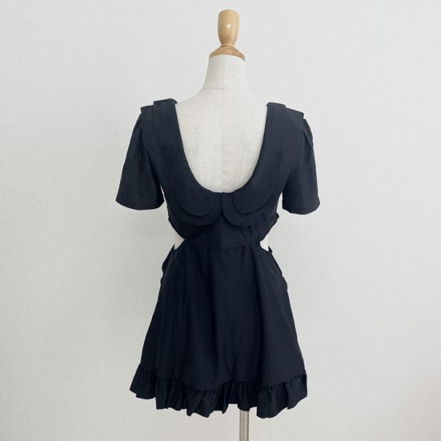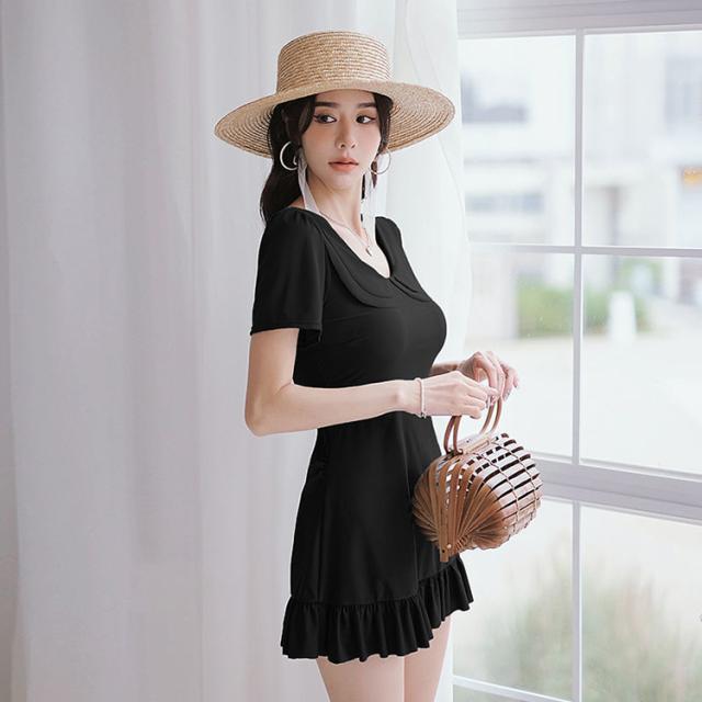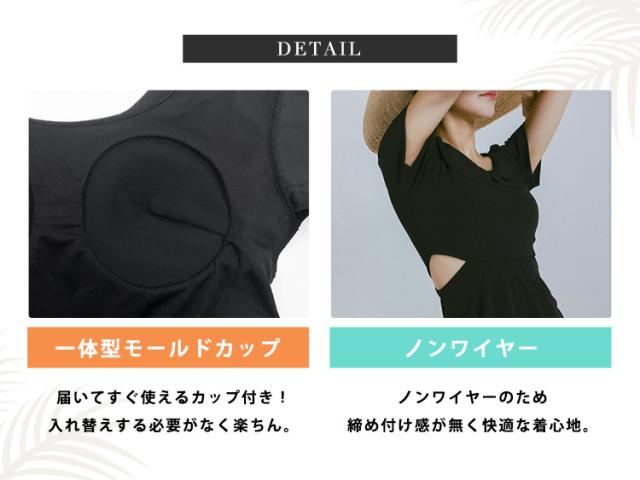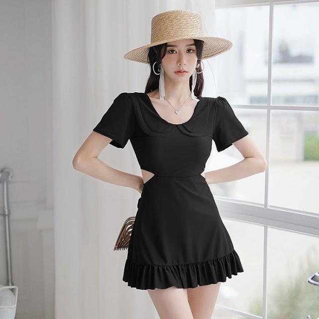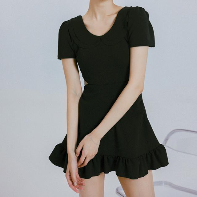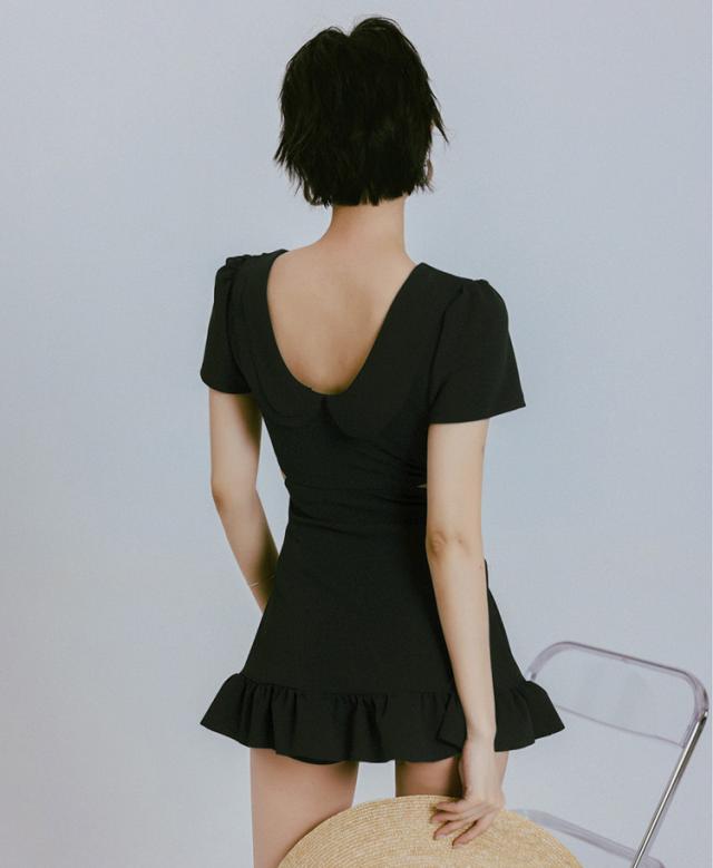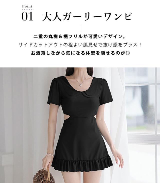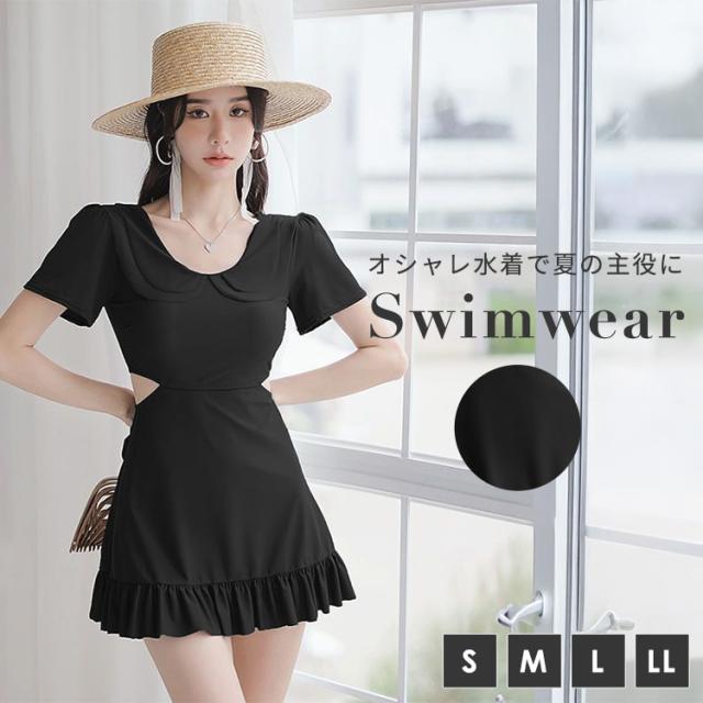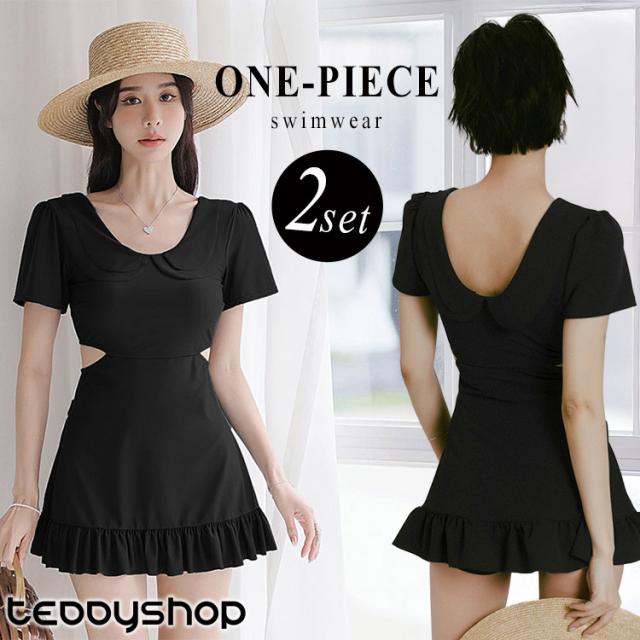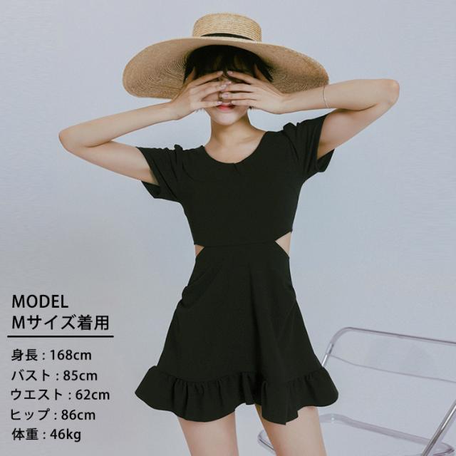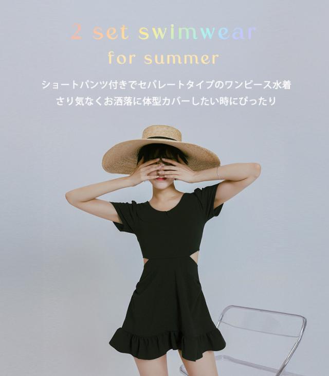 水着 ワンピース 体型カバー レディース セパレート 2点セット ショートパンツ 半袖 丸襟 2重 裾フリル フレア Aライン カットアウト バックオープン モールドカップ ノンワイヤー 二の腕 ウエスト ヒップ 太もも カバーアップ 無地 黒 海