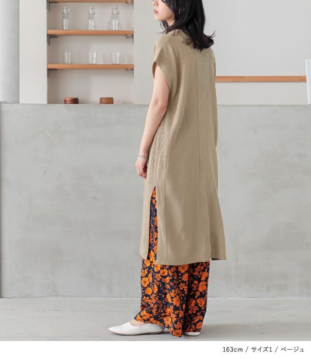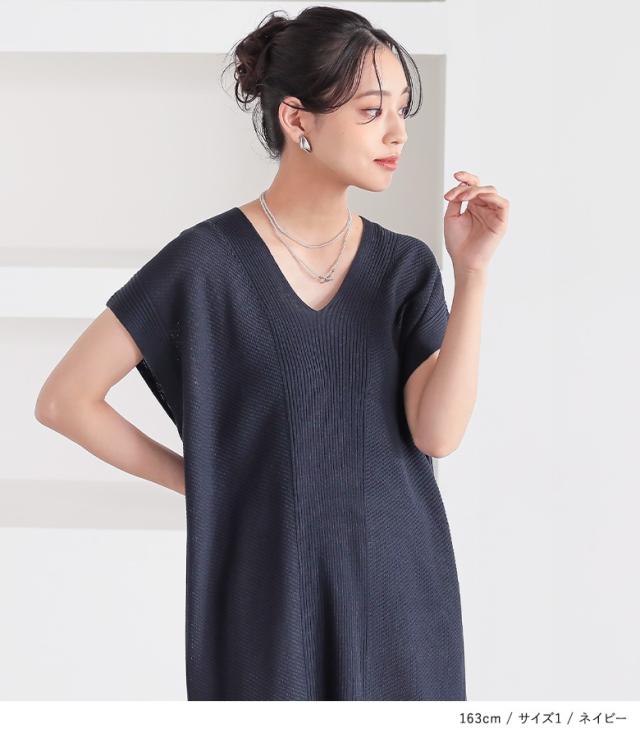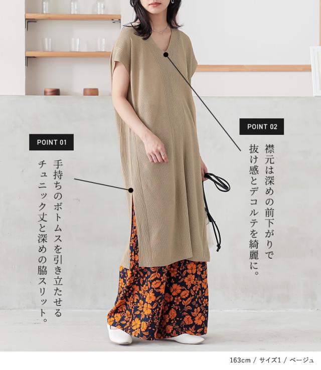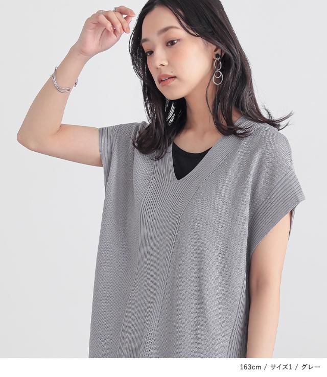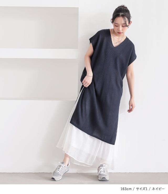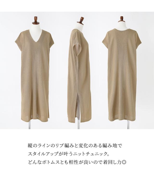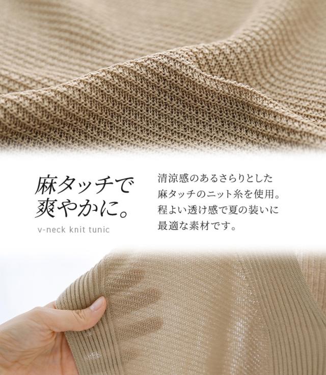 『Vネックニットチュニック』【メール便不可】【20】[ニット チュニック丈 半袖 レディース トップス Vネック リブ編み 麻タッチ スリット 重ね着 レイヤード 体型カバー 透け感 春 夏]