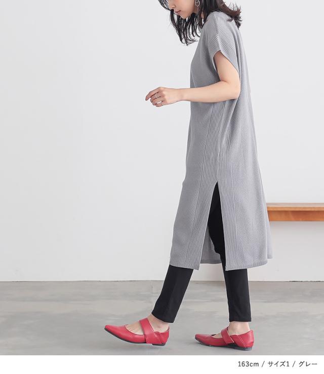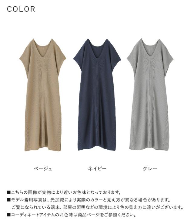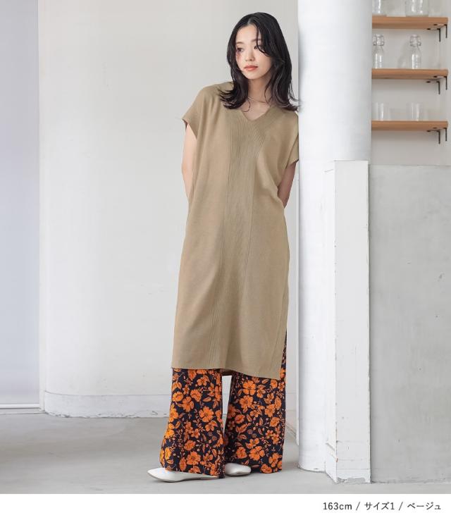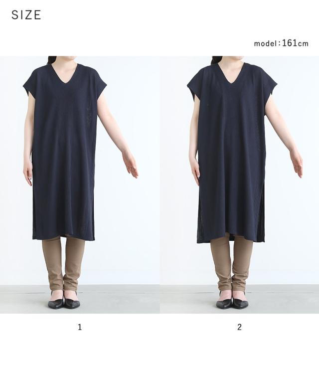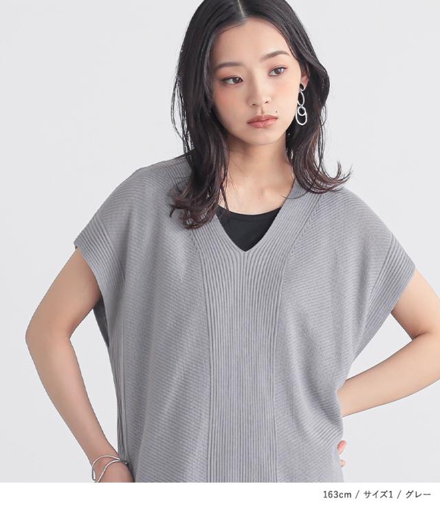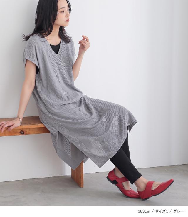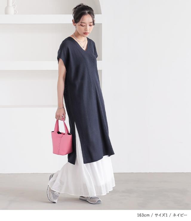 『Vネックニットチュニック』【メール便不可】【20】[ニット チュニック丈 半袖 レディース トップス Vネック リブ編み 麻タッチ スリット 重ね着 レイヤード 体型カバー 透け感 春 夏]