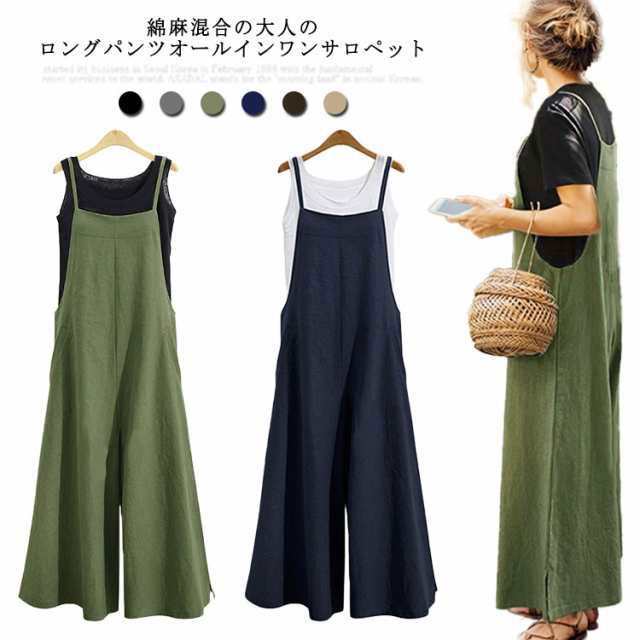 【送料無料】S-6L! サロペット パンツ レディース オールインワン スクエアネック ワイドパンツ ゆるサロペット 春 夏 秋 マタニティ 体型カバー ゆったり リネン コットン ベージュ 茶色 30代 40代 50代 きれいめ