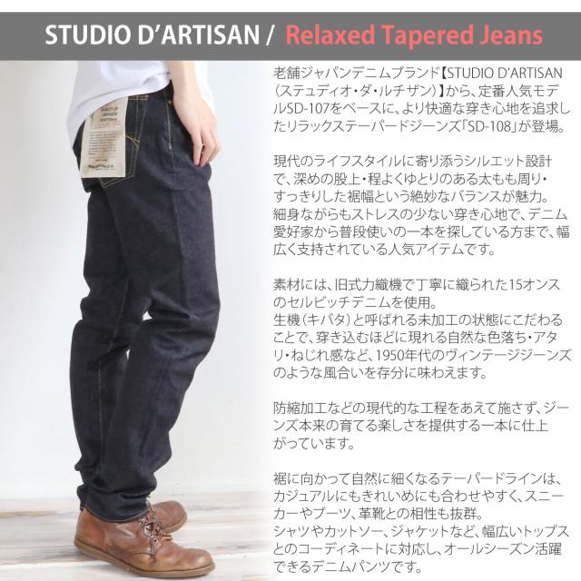 【 日本製 】ジーンズ ステュディオ・ダルチザン 100番台15oz右綾セルヴィッジデニム リラックステーパードジーンズ STUDIO DARTISAN デニムパンツ ( SD-108 ) 細身 ステュディオダルチザン メンズ ボタンフライ ブルーセルビッジ ヴィンテージジーンズ アーベン