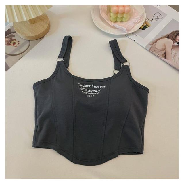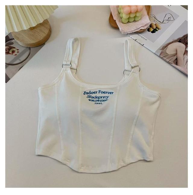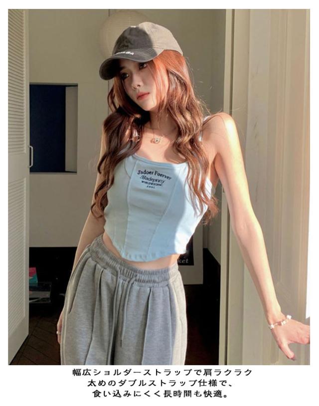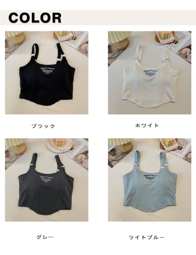 カップ付きキャミソール レディース ショート丈 刺繍ロゴ ダブルストラップ キャミ タンクトップ 通気性 柔らかい 一体型カップ ノースリーブ トップス スリム かわいい おしゃれ フリーサイズ