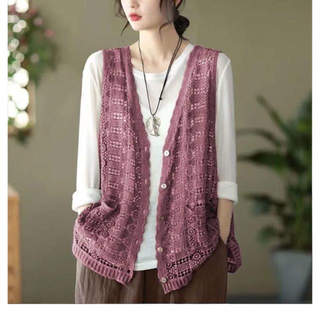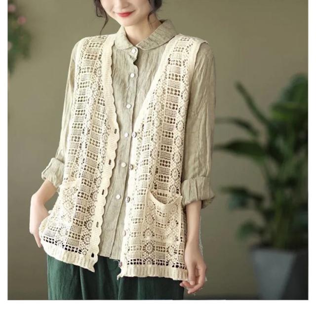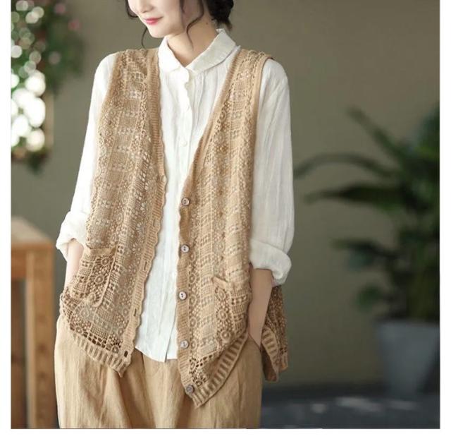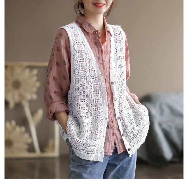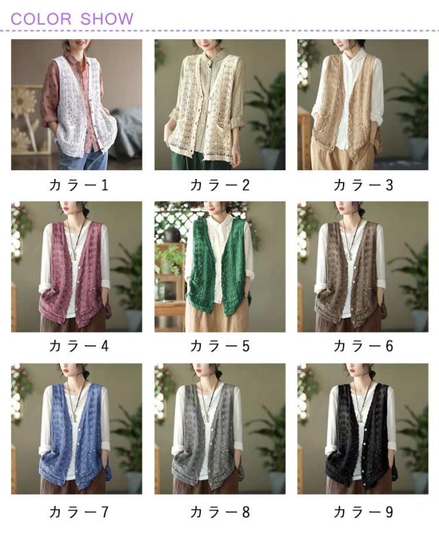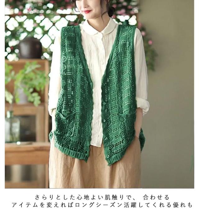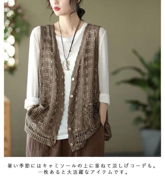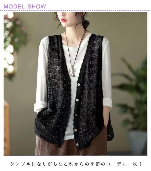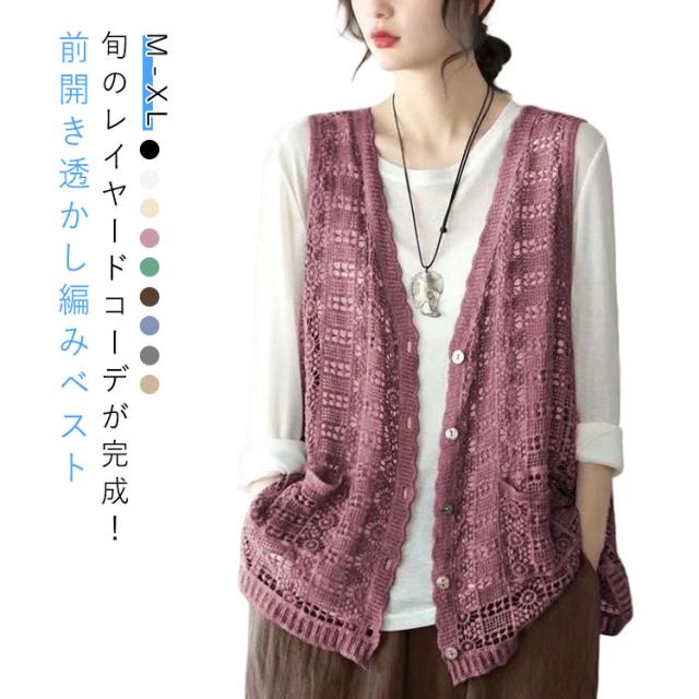 かぎ編み ニットベスト 透かし編み 春 ベスト 前開き 夏 サマーニット ジレ 透かし編み エスニック レイヤード 重ね着 カジュアル レディース カジュアル きれいめ 大人 かわいい レトロ プレゼント ギフト M L