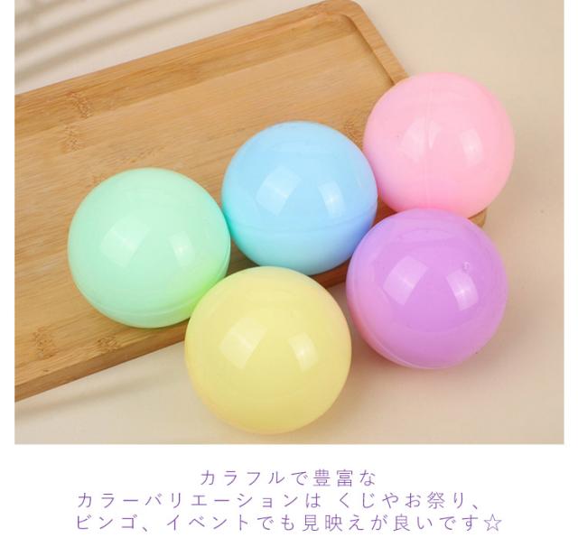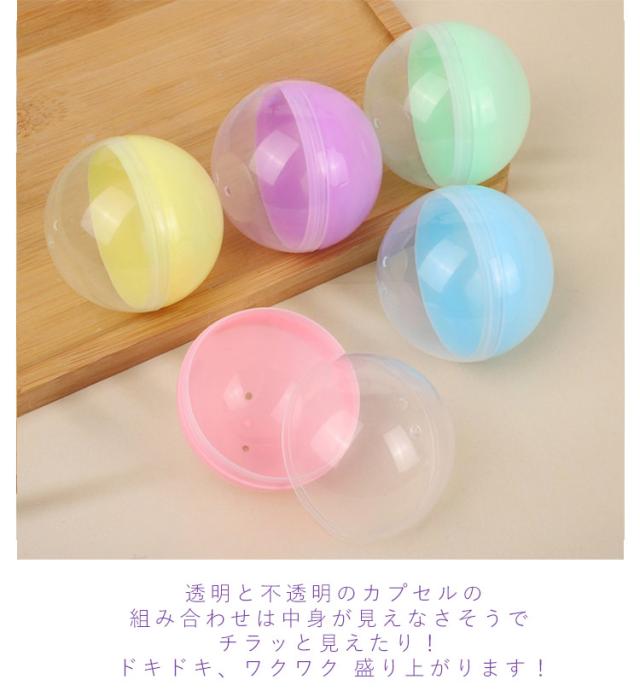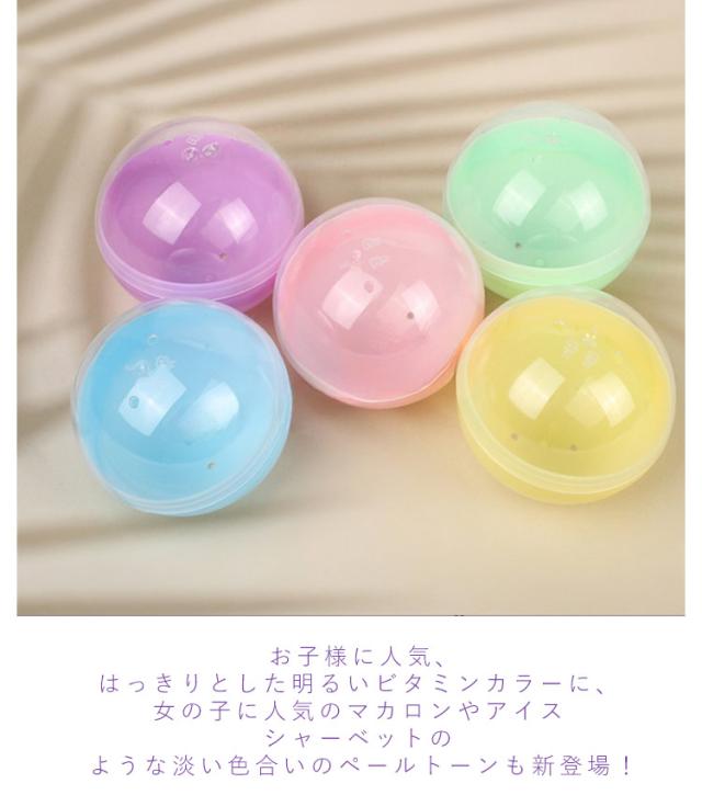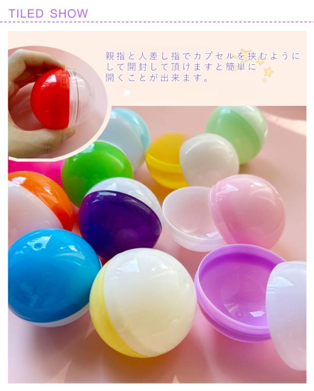 | 全8種類【カラフルなガチャガチャの空カプセル】 100個入っていますので、業務用にもおすすめ☆ お子様に人気、はっきりとした明るいビタミンカラーに、女の子に人気のマカロンやアイス シャーベットのような淡い色合いのペールトーンも新登場! 女子受け抜群!ふんわりと優しいパステルカラー。 カラフルで豊富なカラーバリエーションは くじやお祭り、ビンゴ、イベントでも見映えが良いです☆ 透明と不透明のカプセルの組み合わせは中身が見えなさそうでチラッと見えたり!ドキドキ、ワクワク 盛り上がります! 景品などの小物を入れたり つかみどりやバスボム作りにも♪ 女性やお子様の手にも持ちやすく どなた様にも使って頂きやすいサイズとなっております。 親指と人差し指でカプセルを挟むようにして開封して頂けますと簡単に開くことが出来ます。 | |