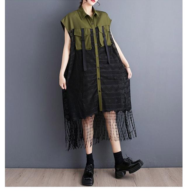 ビッグシルエット シャツワンピース ロングワンピース ノースリーブ 切り替え レース&フリンジパッチワーク Aラインワンピース 大きいサイズ 大人 原宿系 ブラック