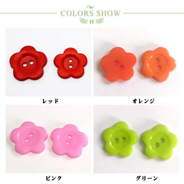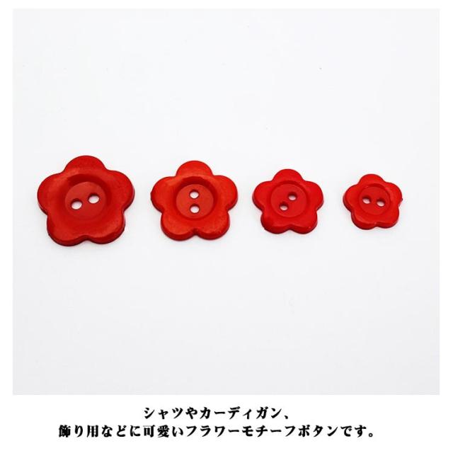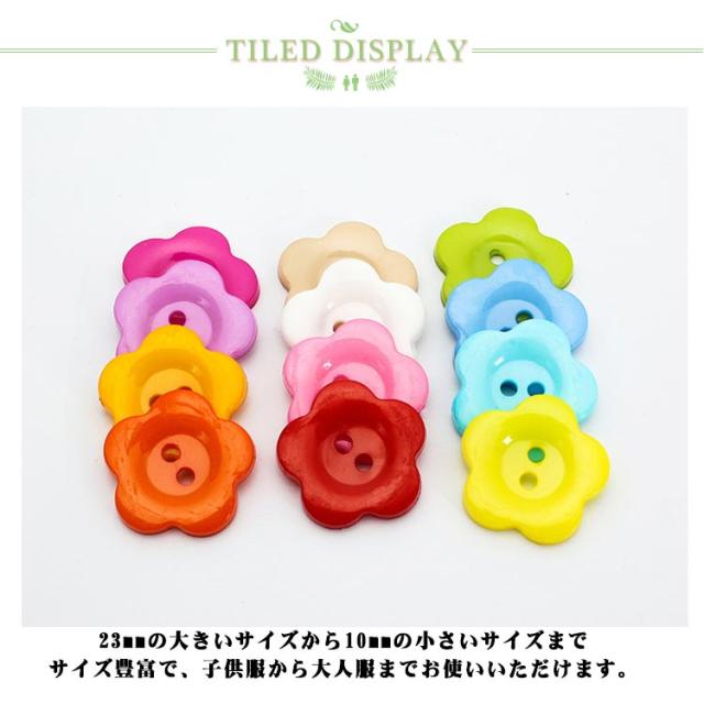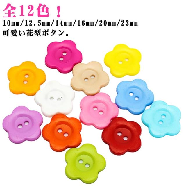 | 全12色!10mm/12.5mm/14mm/16mm/20mm/23mm 可愛い花型ボタン。 23mmの大きいサイズから10mmの小さいサイズまでサイズ豊富で、子供服から大人服までお使いいただけます。 カラバリエーション豊か!お洋服の色に合わせて選べるのも嬉しいポイント。 洋服のリメイクや子供の制服に目印としてつけたり、小物作りになど使用できます。 シャツやカーディガン、飾り用などに可愛いフラワーモチーフボタンです。 | |