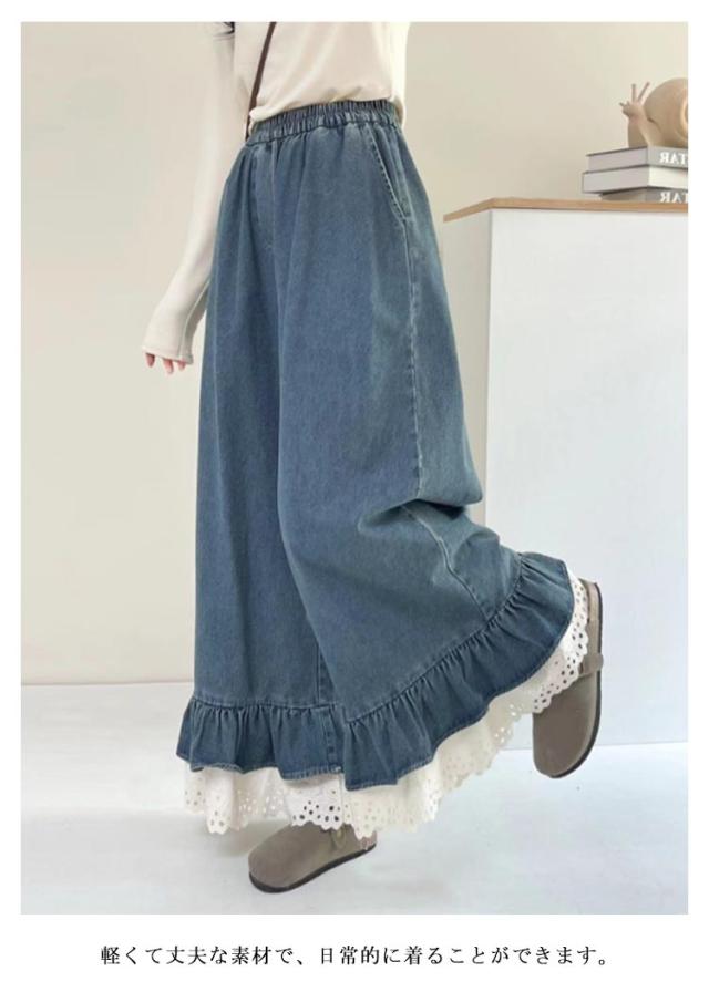 ロング ロングパンツ デニム パンツ ワイド デニムパンツ 切り替え ワイドパンツ フリル ガウチョパンツ レース 裾 ワイド ロング丈 コーデ レディース イージーパンツ 女性 きれいめ スカーチョ ウェストゴム 体型カバー 大きいサイズ 夏 通気性