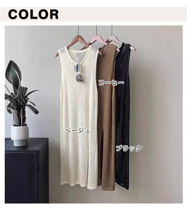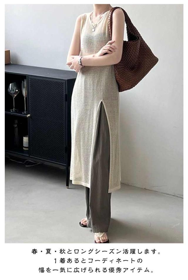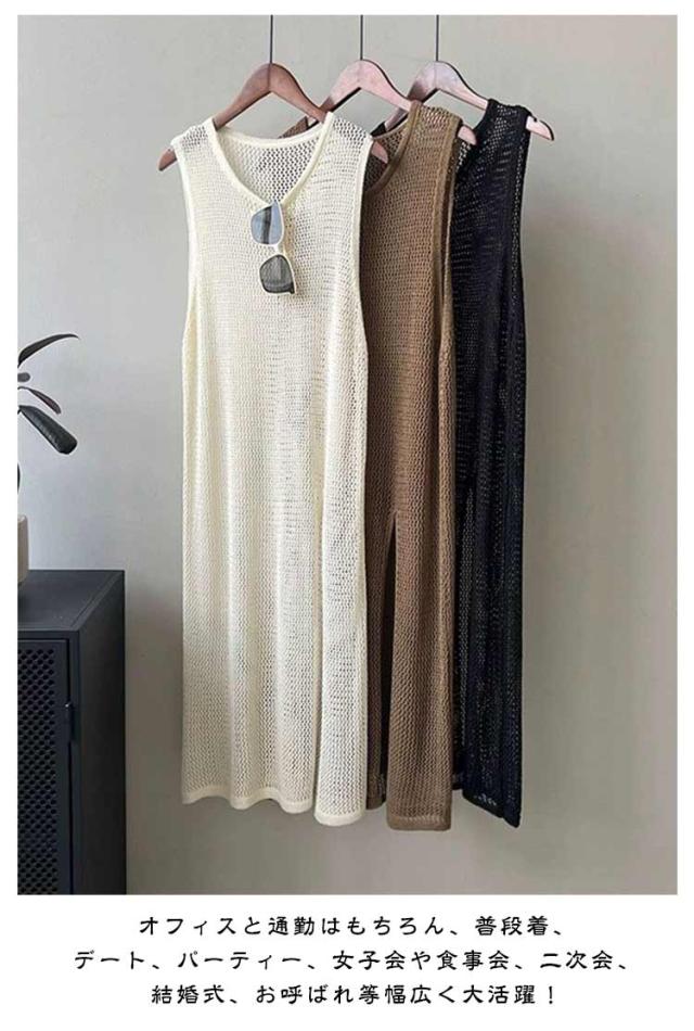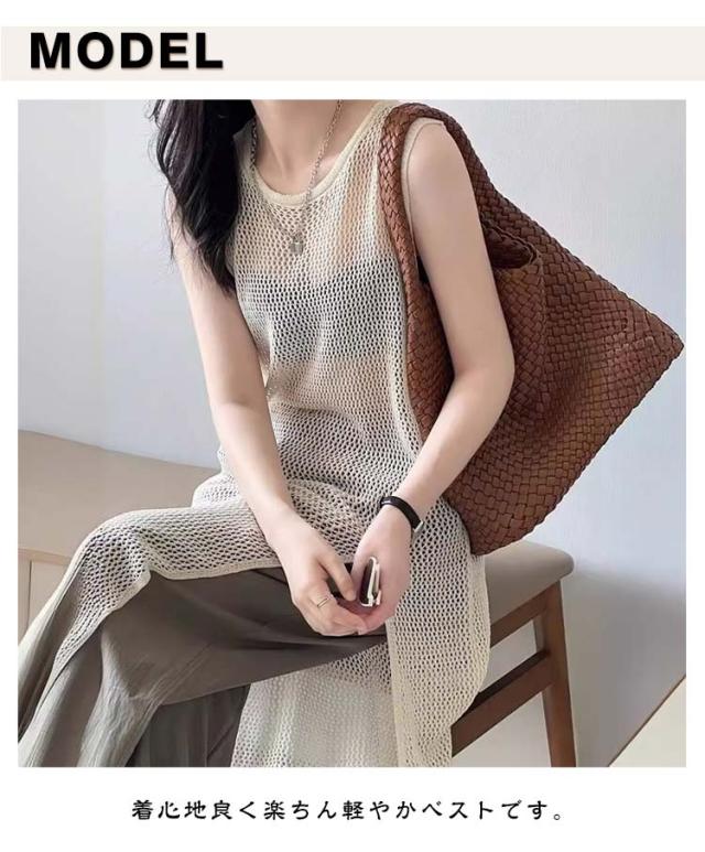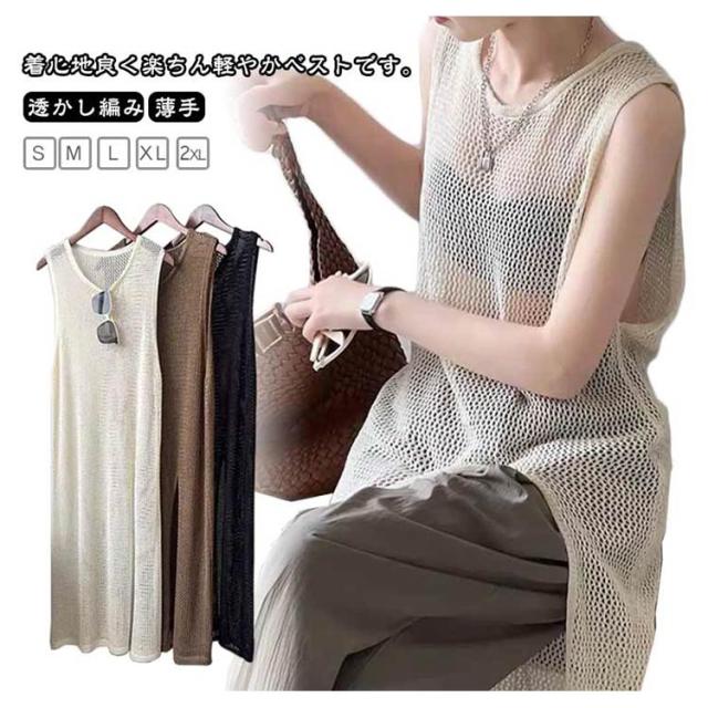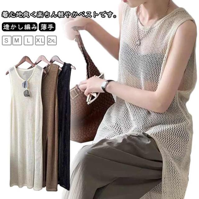 春夏 ジレ ニットベスト 透かし編み 長め かわいい ロングジレ 薄手 トップス ベスト ノースリーブ ゆったり レディース 重ね着 シンプル クルーネック 無地 編み風 着?せ 体型カバー きれいめ 可愛い ベスト 春 夏 おしゃれ