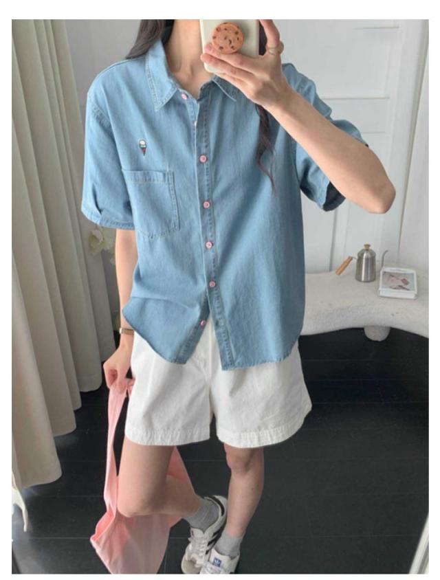 | 大人可愛い 刺?ロゴデザイン 半袖デニムシャツ 気温の高い日も涼しく着られる!着回し力抜群の薄手デニムシャツ リラックス感のあるシルエットながらも、きちんとした印象のオープンカラーの半袖デニムシャツです。 合わせやすいなデザインで、1枚持っているとコーディネートの幅がぐっと広がります。 またオープンカラーなので1枚着のトップスとしてはもちろん、前ボタンを開けてTシャツの上に着る羽織としても着用いただけます。 胸ポケットに施した「アイスクリーム」刺繍ロゴがワンポイントになっています。 薄手で柔らかいデニム生地を使用しているため着心地が良く、気温の高い日も快適に着ていただけます。 | |