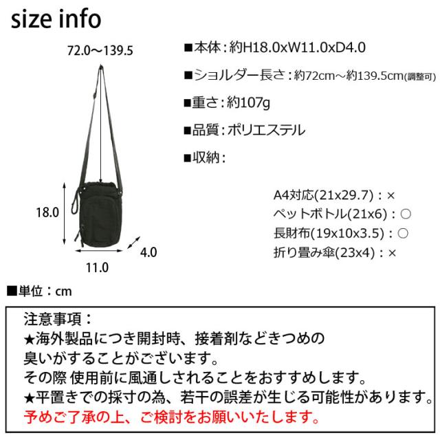 縦:約18cm 幅:約11cm マチ:約4cm ショルダー長さ:約72cm〜約139.5cm(調整可)