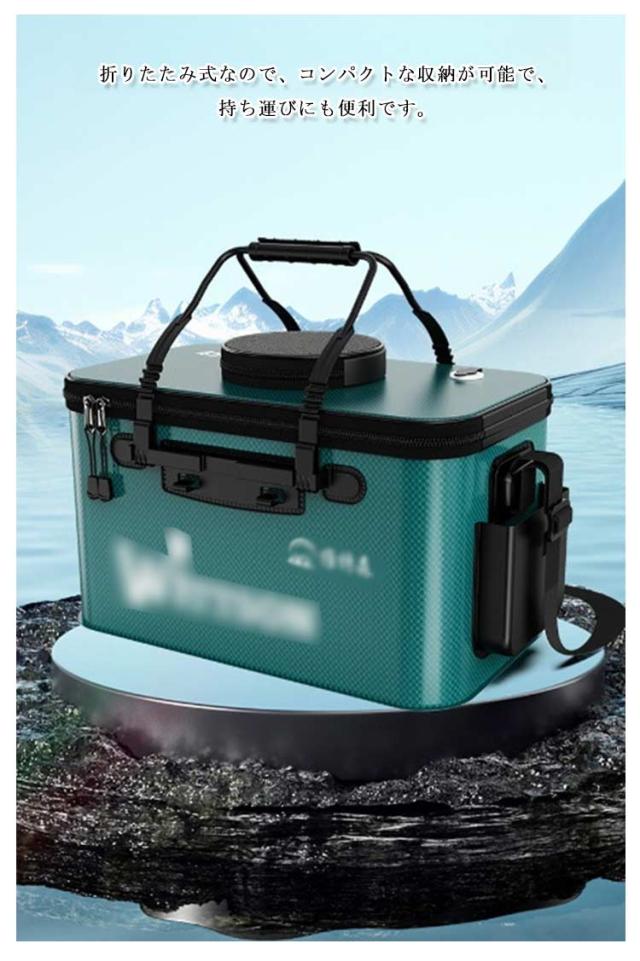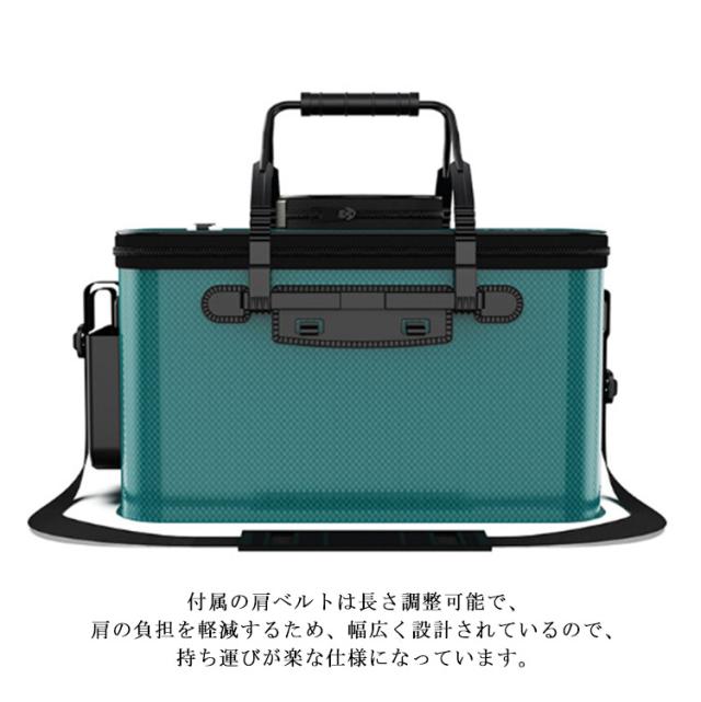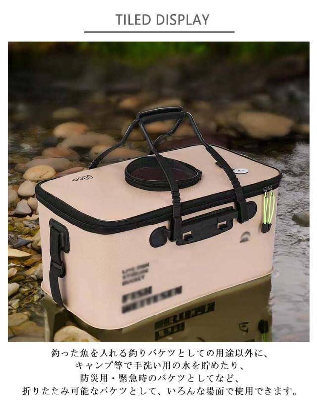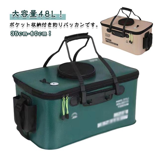 | 大容量48L!ポケット収納付き釣りバッカンです。 蓋の真ん中にメッシュカバーが付いていて、魚のために新鮮な空気を保てます。 折りたたみ式なので、コンパクトな収納が可能で、持ち運びにも便利です。 付属の肩ベルトは長さ調整可能で、肩の負担を軽減するため、幅広く設計されているので、持ち運びが楽な仕様になっています。 釣った魚を入れる釣りバケツとしての用途以外に、キャンプ等で手洗い用の水を貯めたり、防災用・緊急時のバケツとしてなど、折りたたみ可能なバケツとして、いろんな場面で使用できます。 厚くしたEVA材質を使用しているため、強度な耐久性と防水性を兼ね備えています。大容量を重視してバケツの中には仕切りがなく、耐荷重は約50kgに上ります。 | |