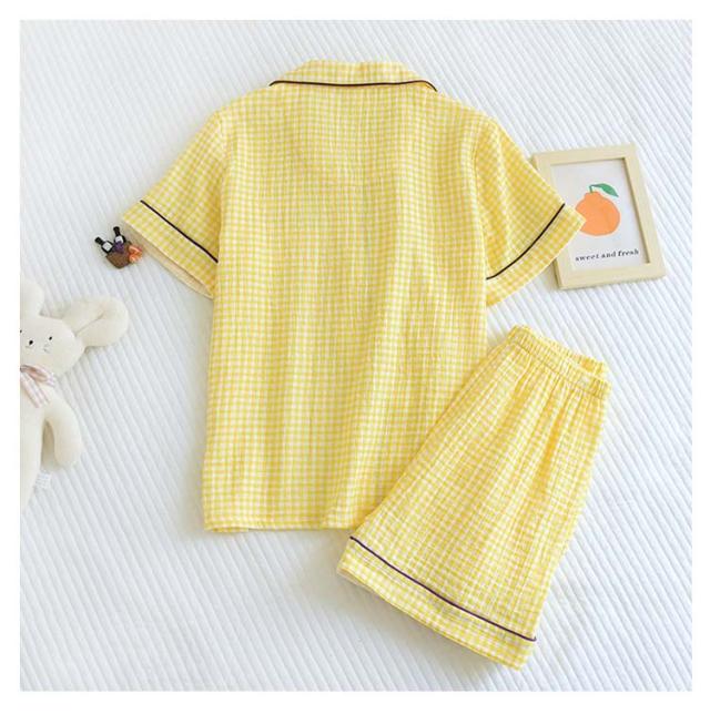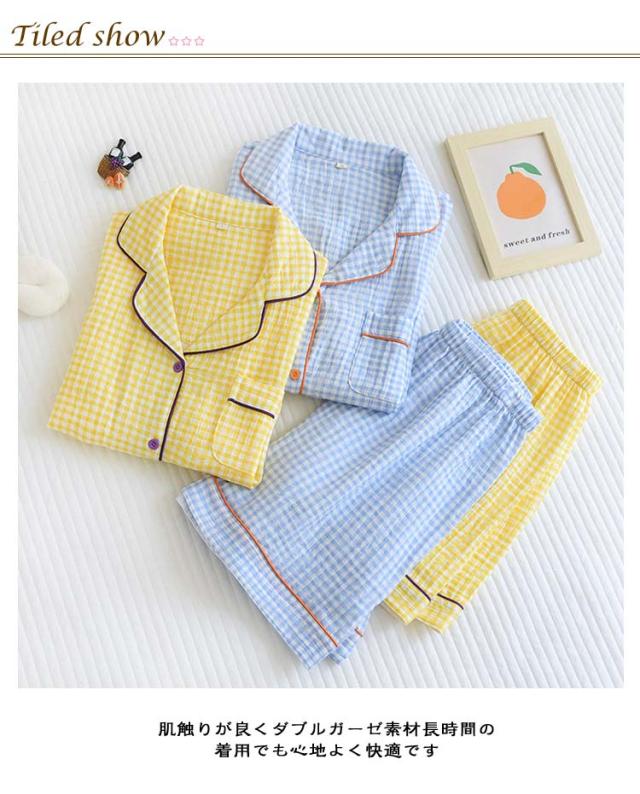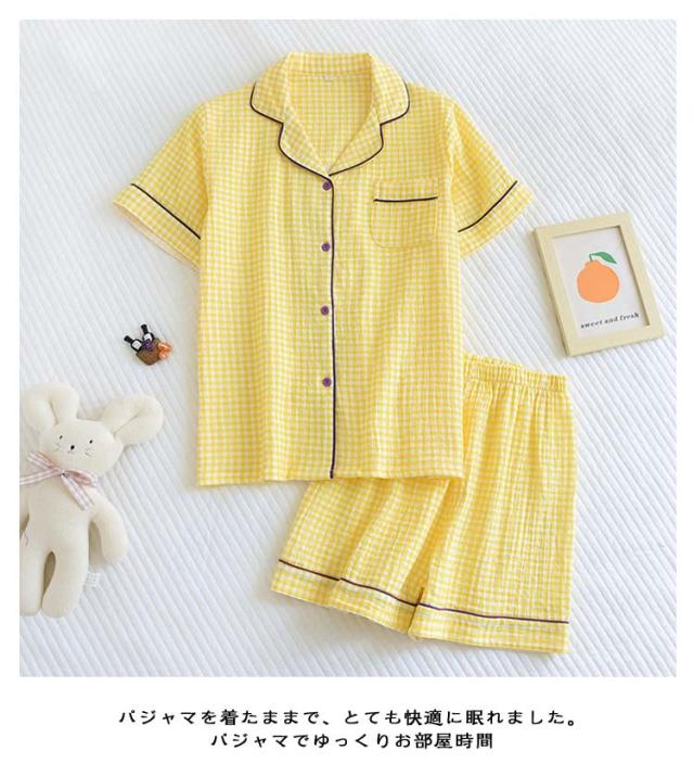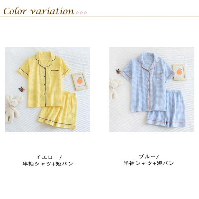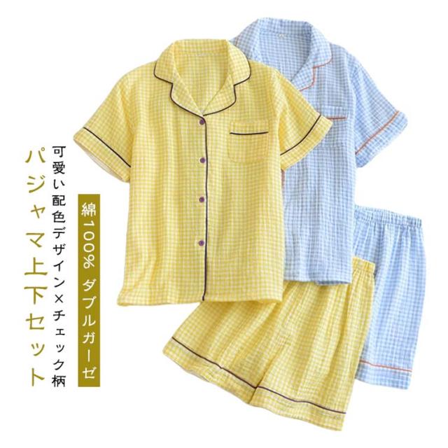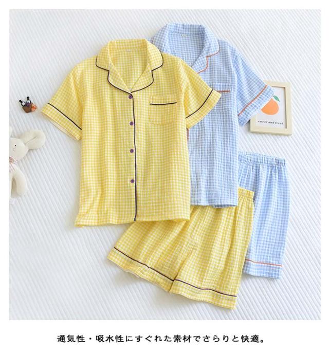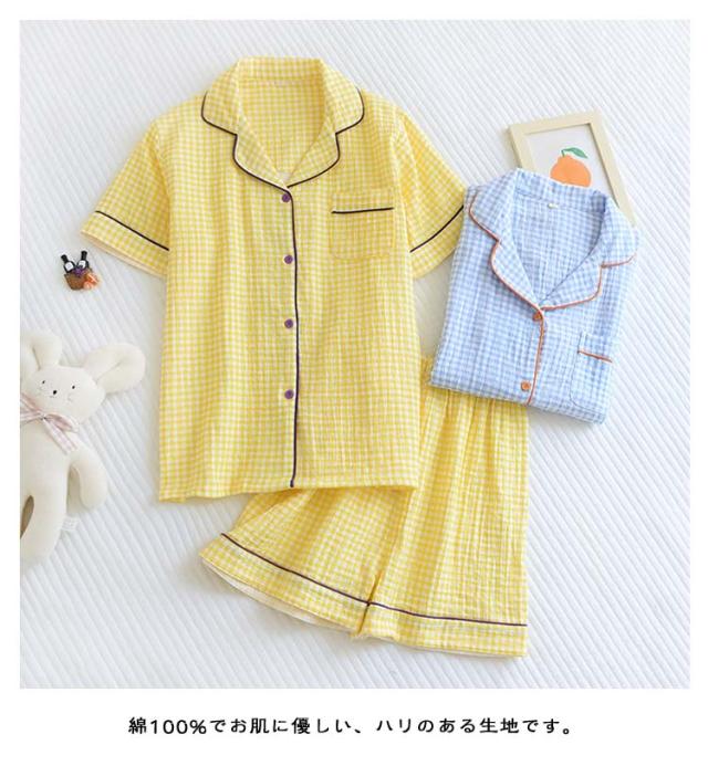 ダブルガーゼ ガーゼ パジャマ チェック柄 レディース セットアップ 綿100% 半袖 綿100% ハーフパンツ 綿 tシャツ 夏 二重ガーゼ ナイトウェア 上下セット ルームウェア トップス パンツ ウエストゴム ふんわり 着心地 ゆったり
