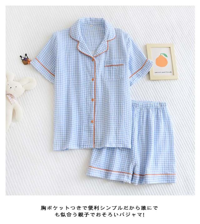 | 綿100% ダブルガーゼ 可愛い配色デザイン×チェック柄 パジャマ上下セット 肌触りが良くダブルガーゼ素材長時間の着用でも心地よく快適です 綿100%でお肌に優しい、ハリのある生地です。 通気性・吸水性にすぐれた素材でさらりと快適。 パジャマを着たままで、とても快適に眠れました。 パジャマでゆっくりお部屋時間♪ 胸ポケットつきで便利シンプルだから誰にでも似合う親子でおそろいパジャマ! | |