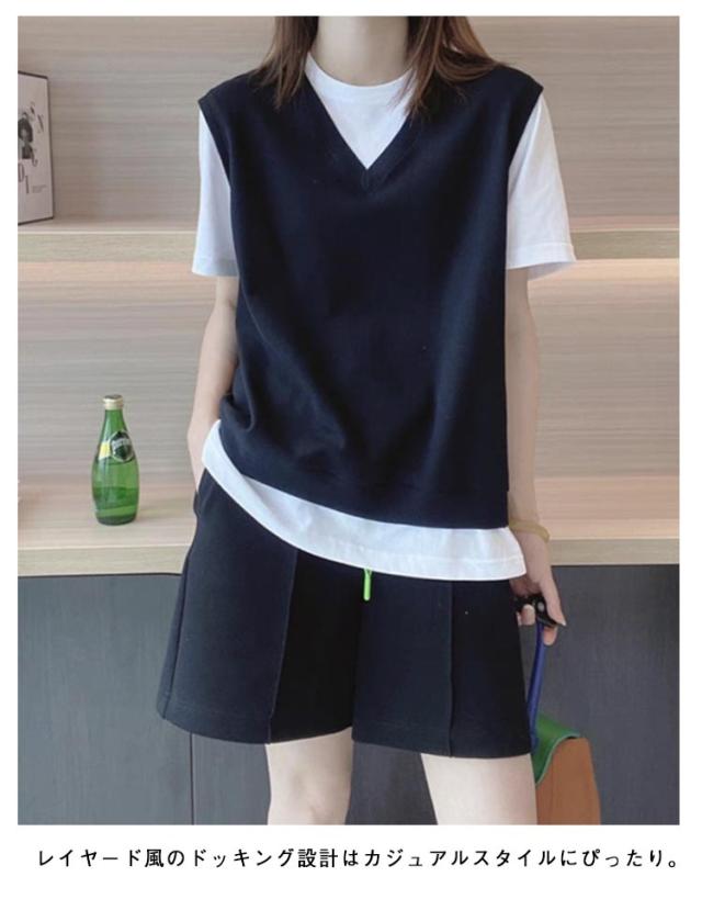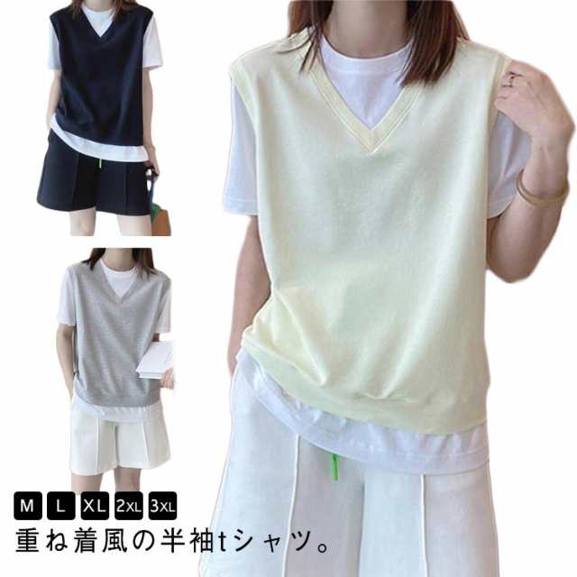 ベストフェイクレイヤードプルオーバー 大きいサイズ レディース トップス カットソー 半袖 5分袖 フェイクレイヤード ベスト Tシャツ Vネック 重ね着風 夏新作 夏服 春服 20代 30代 40代 50代 M L XL 2XL 3XL