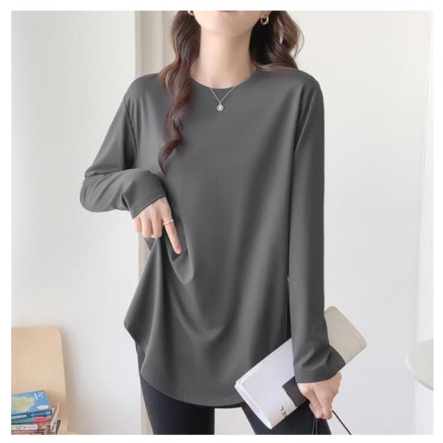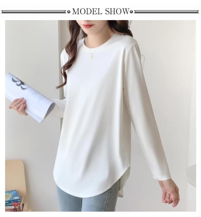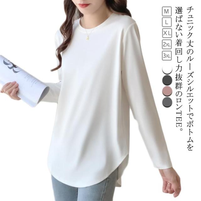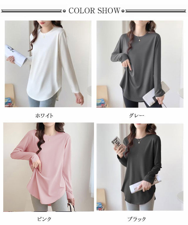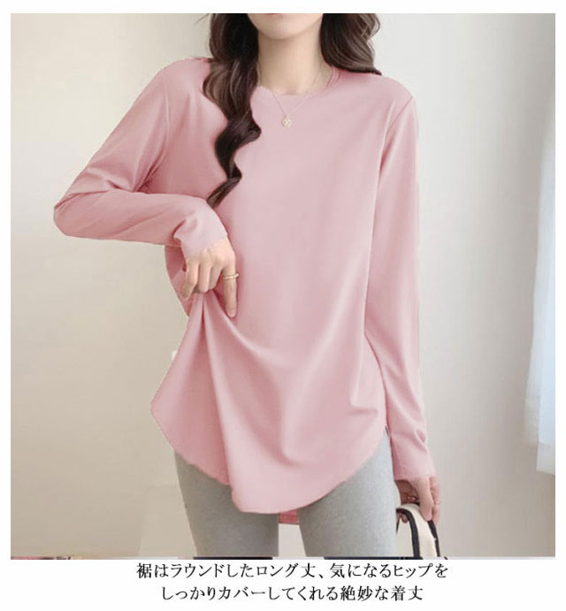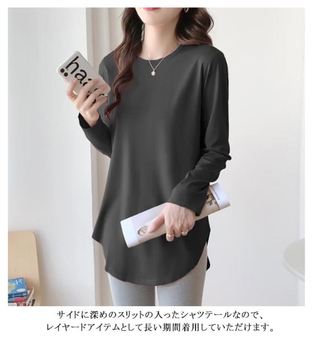 長袖 tシャツ カットソー クルーネック チュニック丈 ロンt レディース 長袖tシャツ サイドスリット ラウンドカット レイヤード 重ね着 ロングtシャツ 春 秋 冬 薄手 インナー ゆったり お尻が隠れる 秋服 秋物 おしゃれ 無地 シンプル カジュアル 黒 白 ピンク
