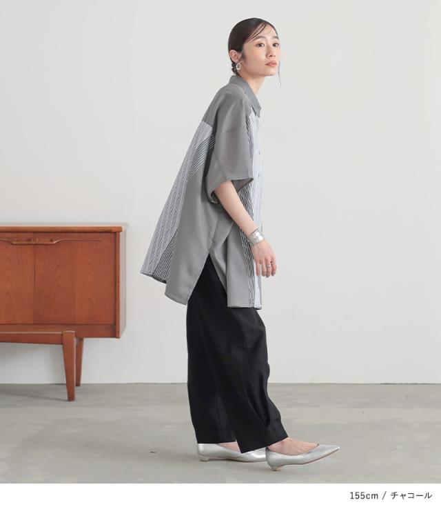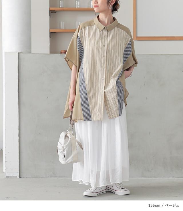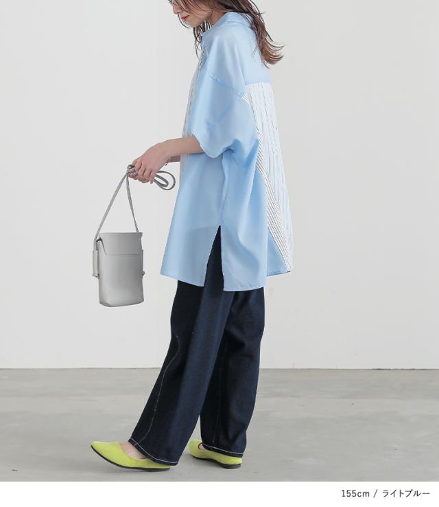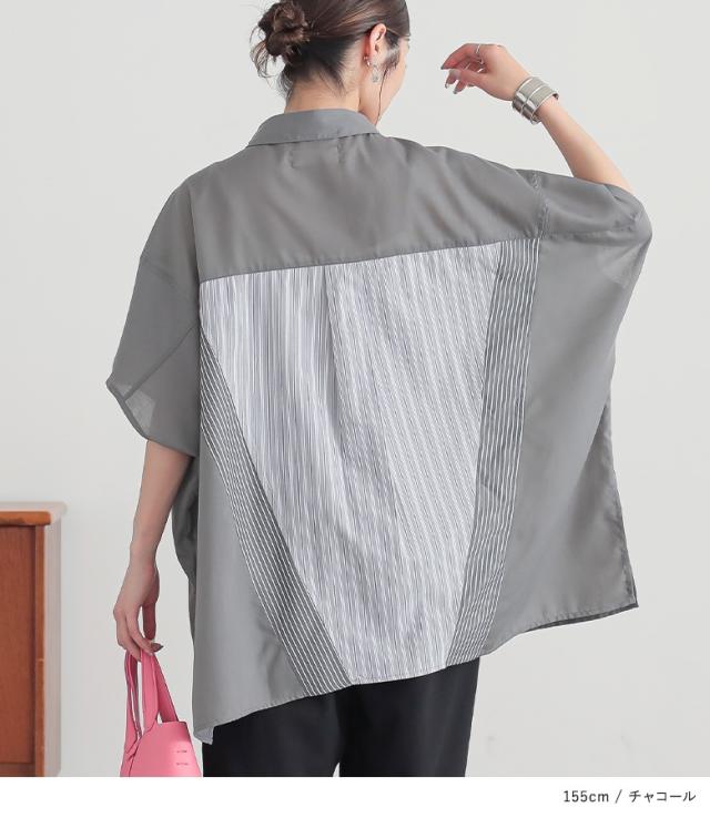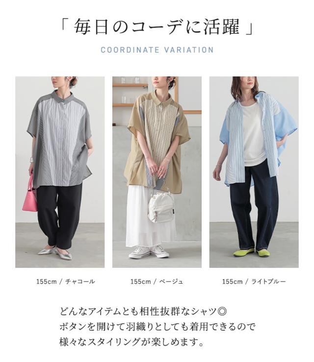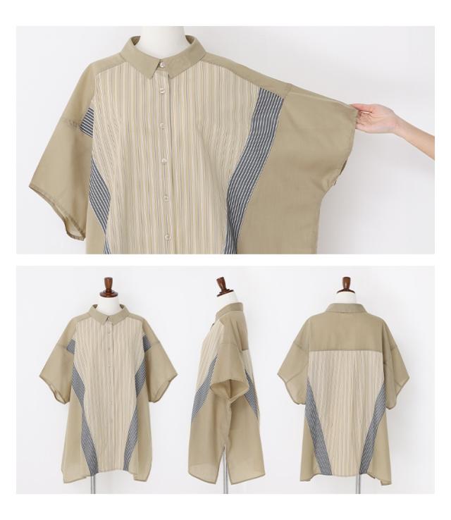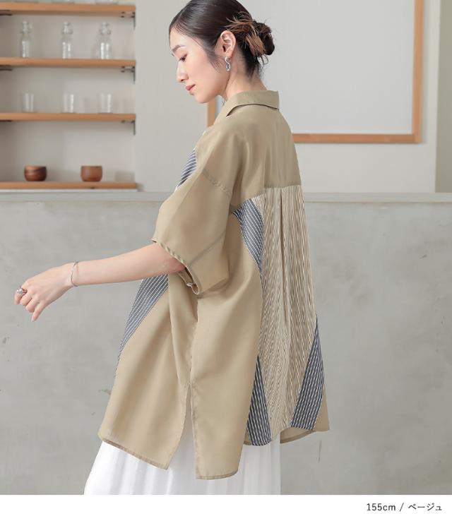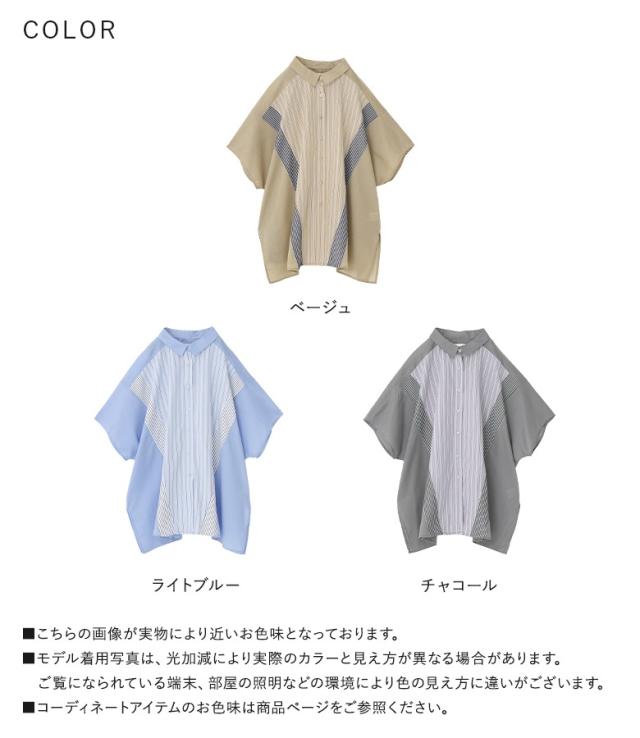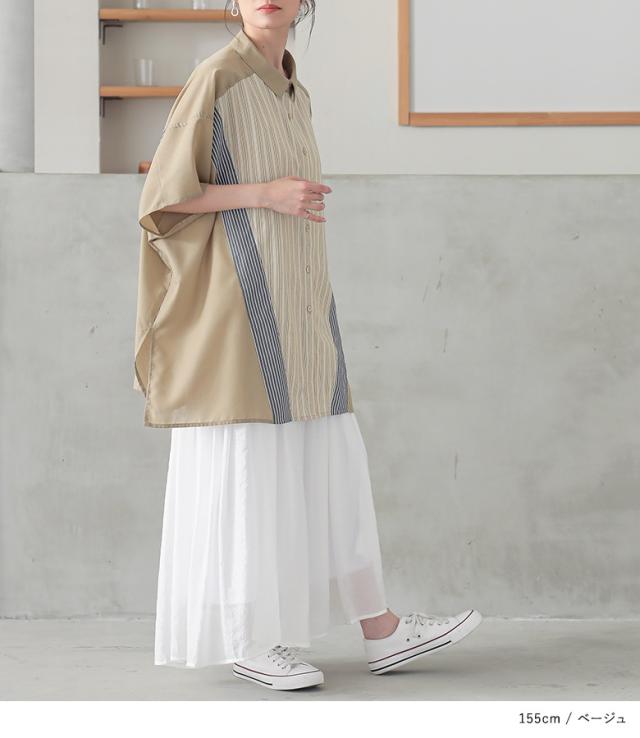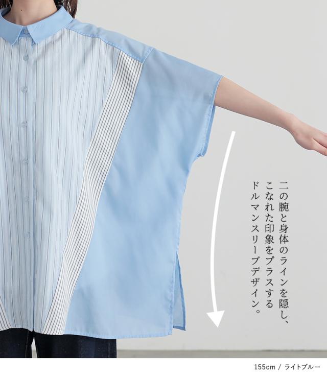 『切替ストライプドルマンシャツ』※メール便可※【10】[シャツ レディース トップス 半袖 ドルマンシャツ 羽織 レイヤード 重ね着 ストライプ柄 無地 ブラウス ゆったり 体型カバー 春 夏]