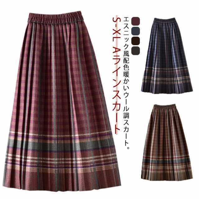 レディース プリーツスカート チェック スカート ロングスカート 秋冬 ロング ウール調 Aラインスカート ウエストゴム 膝下 体型カバー おしゃれ オフィス フレアスカート シンプル 大人 オフィス カジュアル