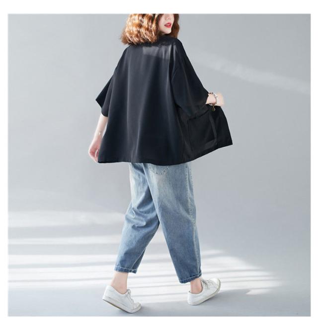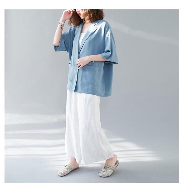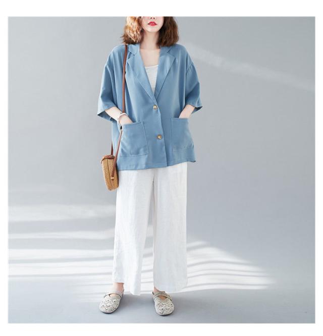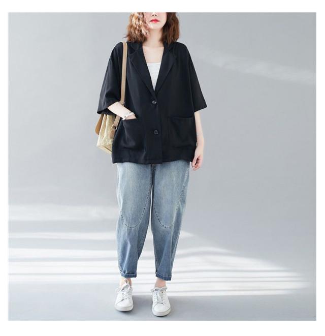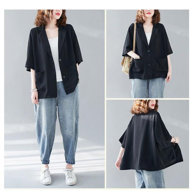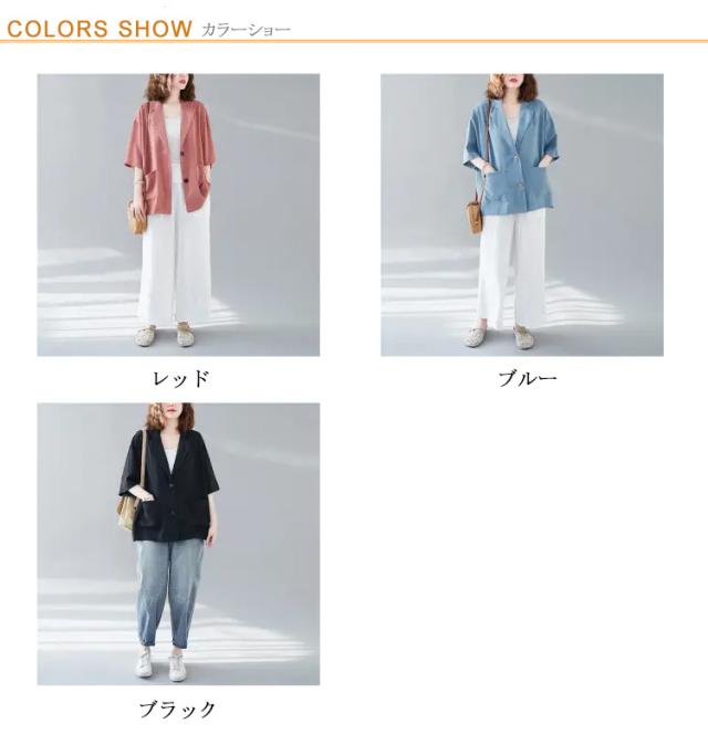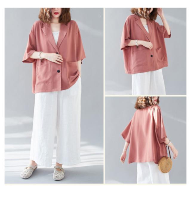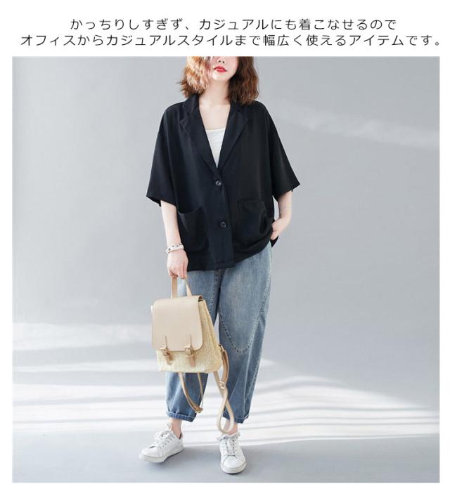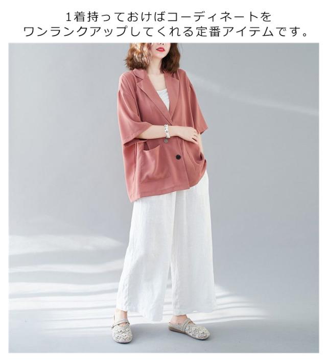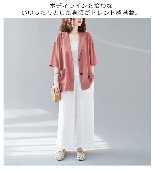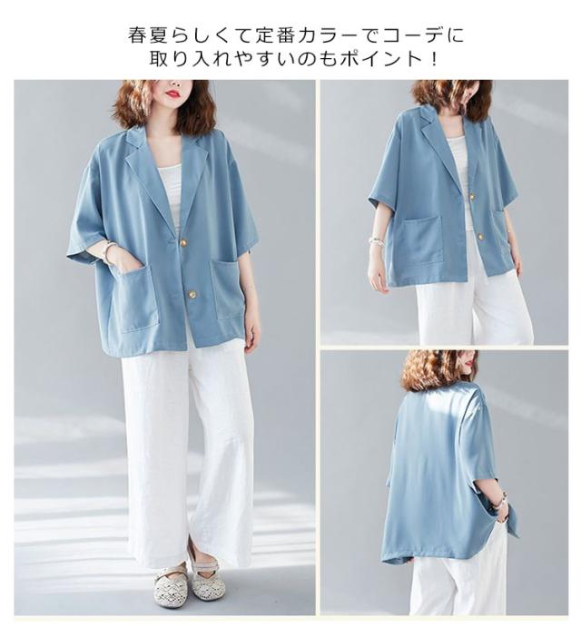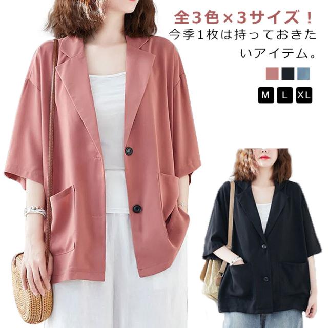 五分袖 サマージャケット レディース テーラードジャケット 送料無料 半袖 大きサイズ サマー カーディガン 二つボタン 折り襟 ポケット付き ルーズ 夏ジャケット 春夏 ゆったり 無地 レイヤード