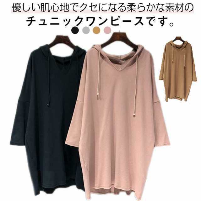 チュニックパーカー ワンピース 春秋 パーカー チュニックパーカー プルオーバー トップス カットソー チュニック 長袖 薄手 フード付き ゆったり 大きなサイズ ゆる袖 体型カバー ナチュラル