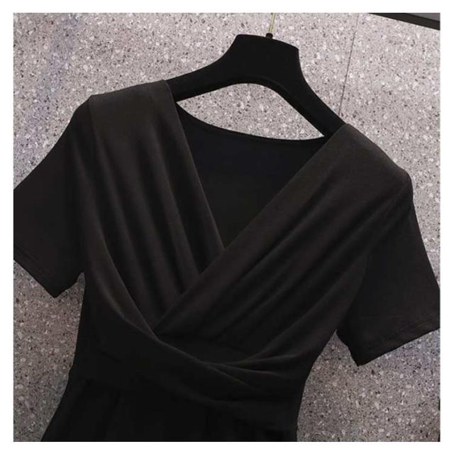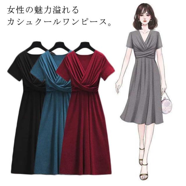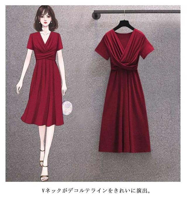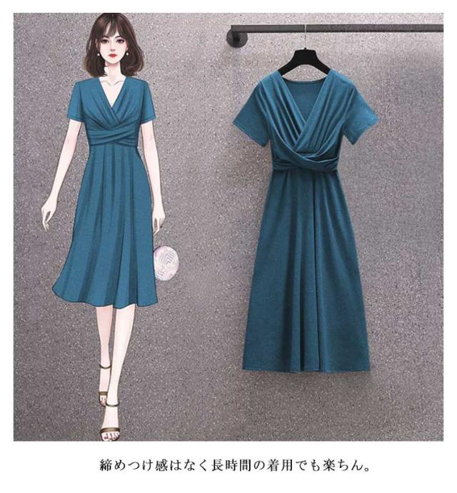 ストレッチ カジュアル スリム レディース きれいめ Vネック おしゃれ 半袖ワンピ 春 夏 大人 女性 半袖 Tシャツワンピース ハイウエスト Aライン Vネック 膝丈ワンピース ひざ丈 脚長 シンプル タイト 着?せ 無地 シンプル 大きいサイズ